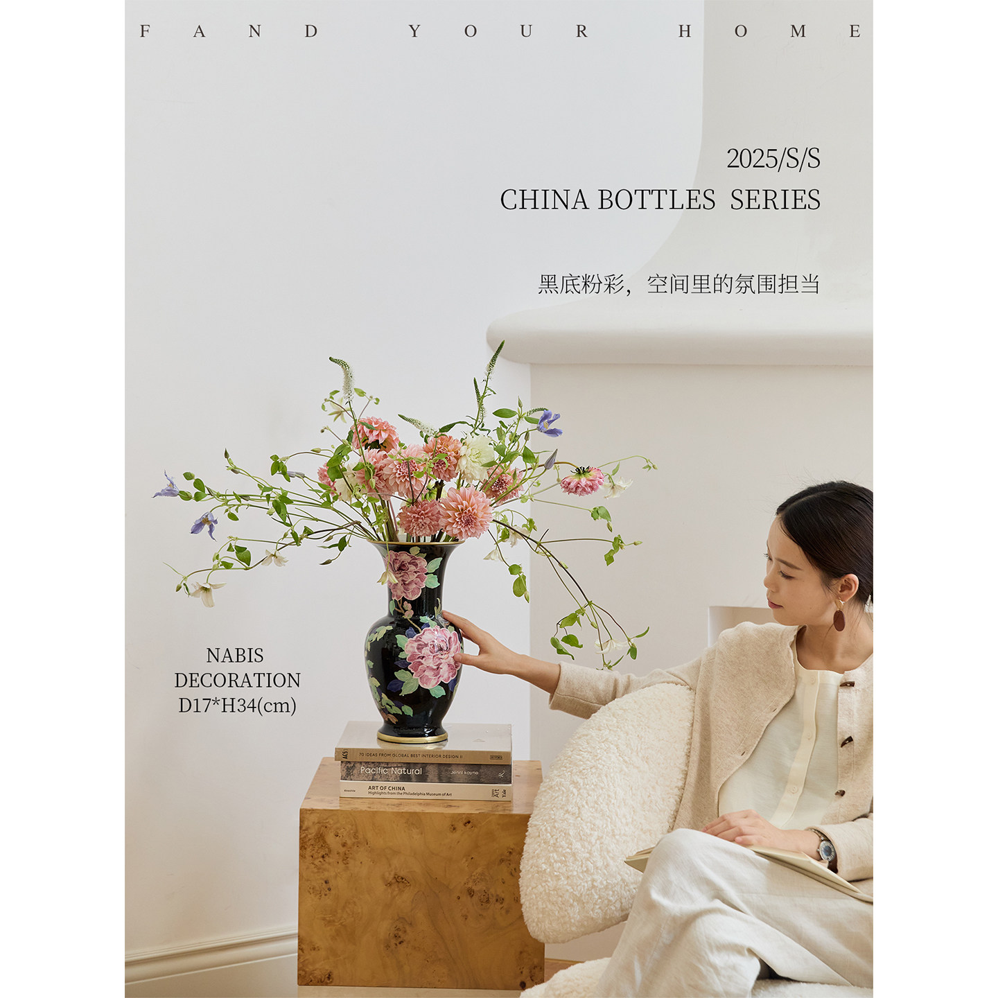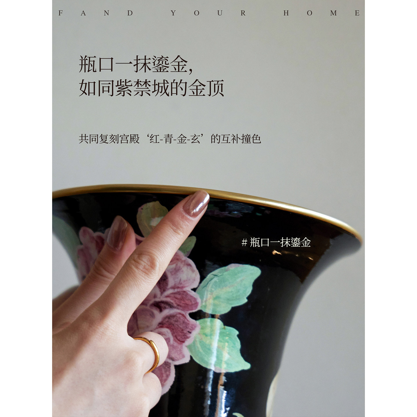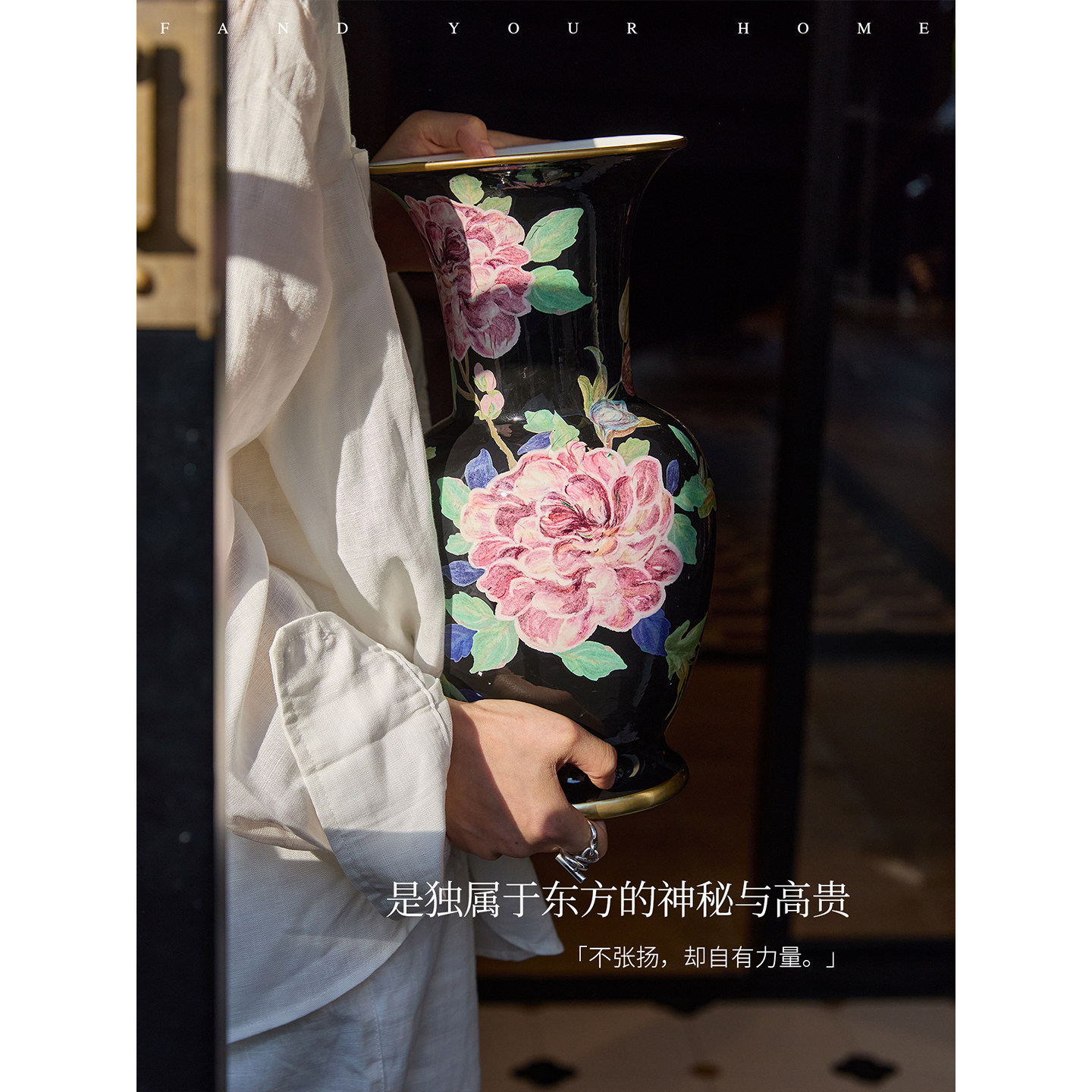 蜡笔派牡丹花瓶联名款手绘釉下彩黑釉复古陶瓷好寓意插花家居摆件