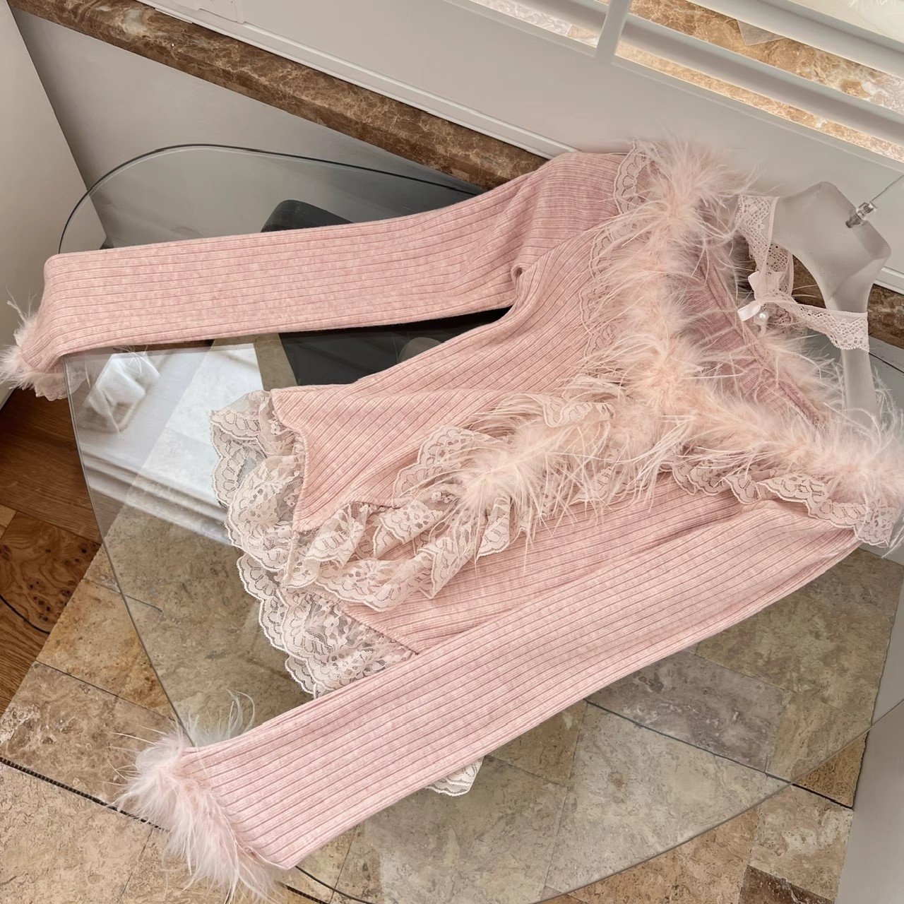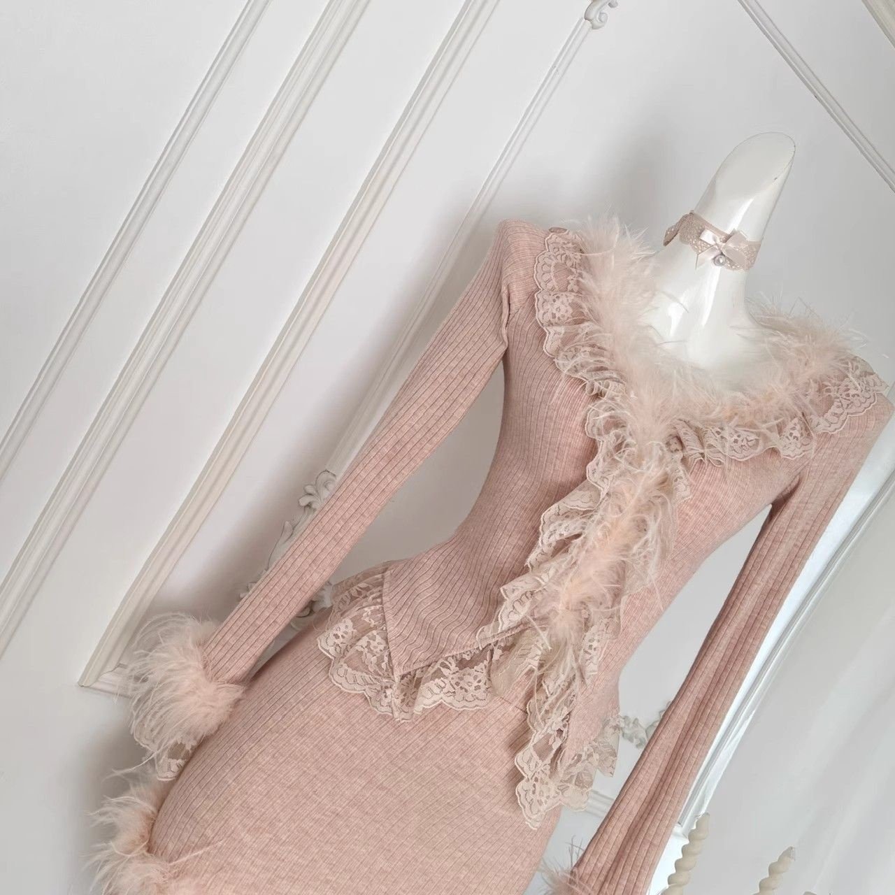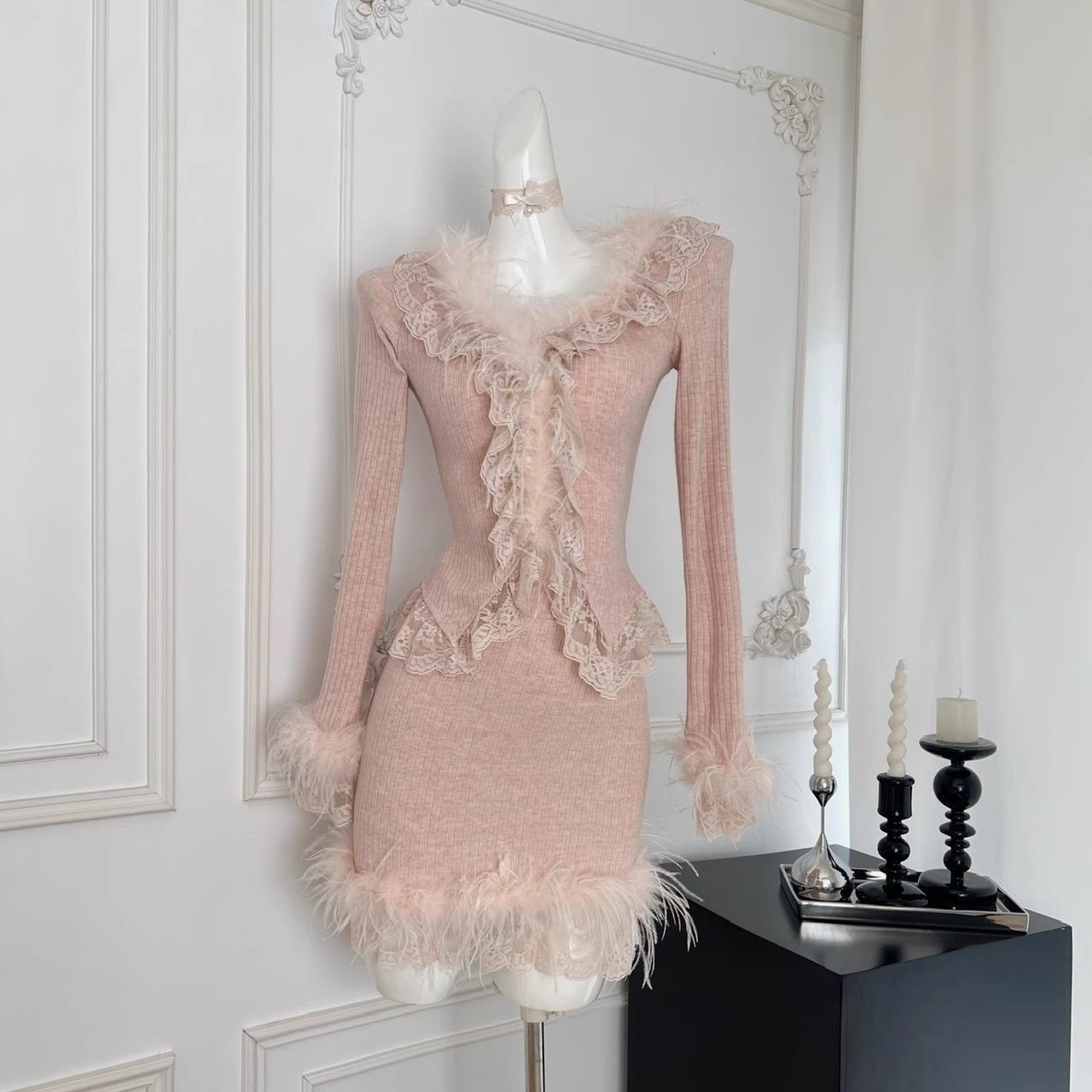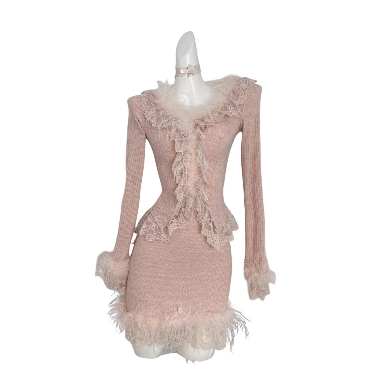 纯欲风大码胖mm套装女秋季粉色毛毛拼接修身上衣高腰包臀裙两件套