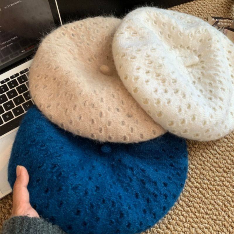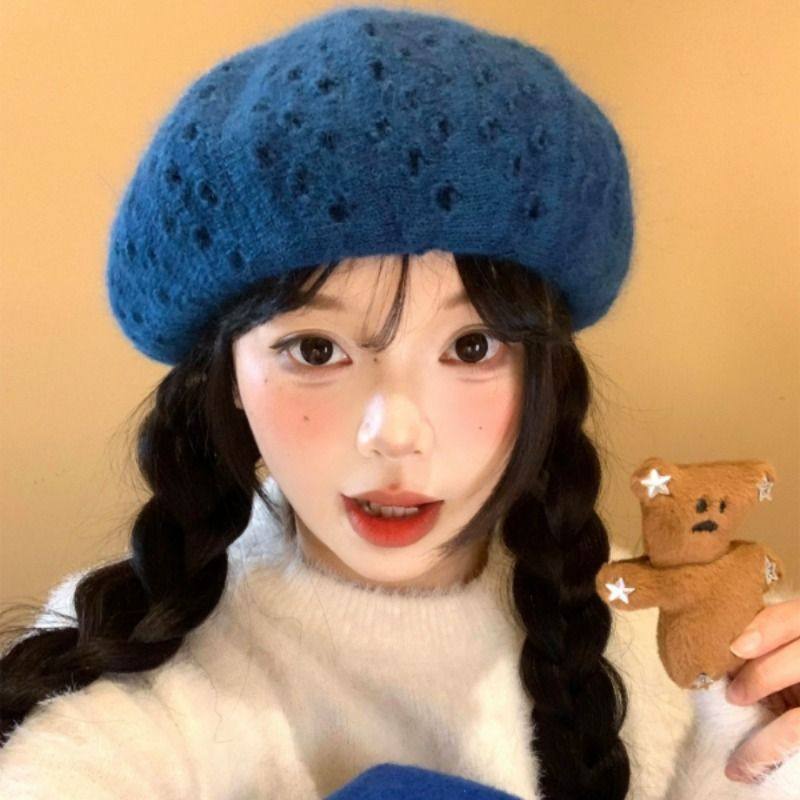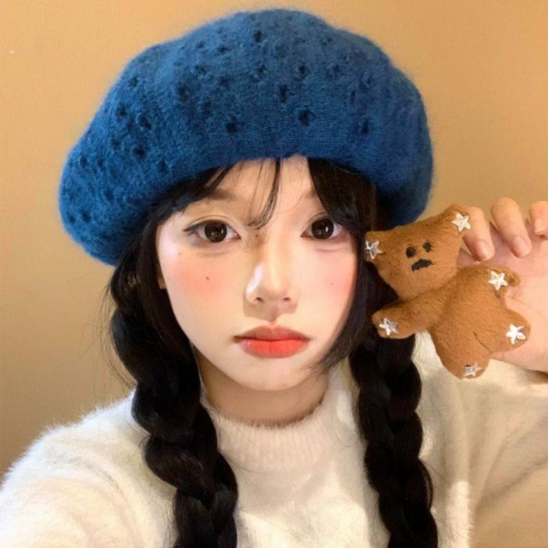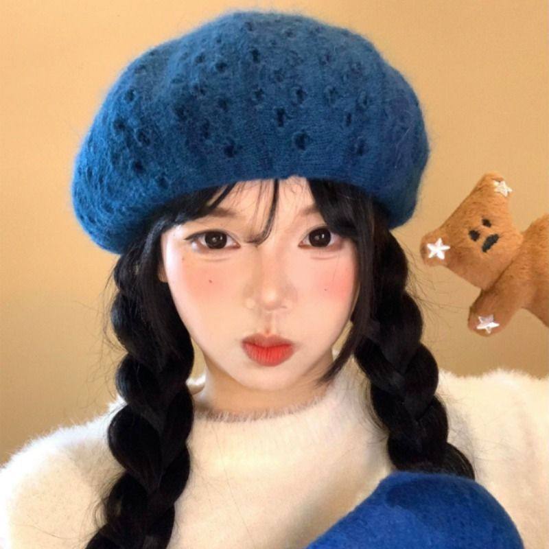 蓝色破洞针织贝雷帽女秋冬季日系百搭显脸小蓓蕾帽大头围画家帽子