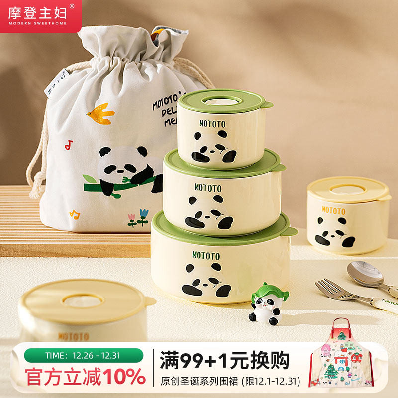 摩登主妇mototo熊猫陶瓷饭盒上班族可微波炉加热密封保鲜碗便当盒
