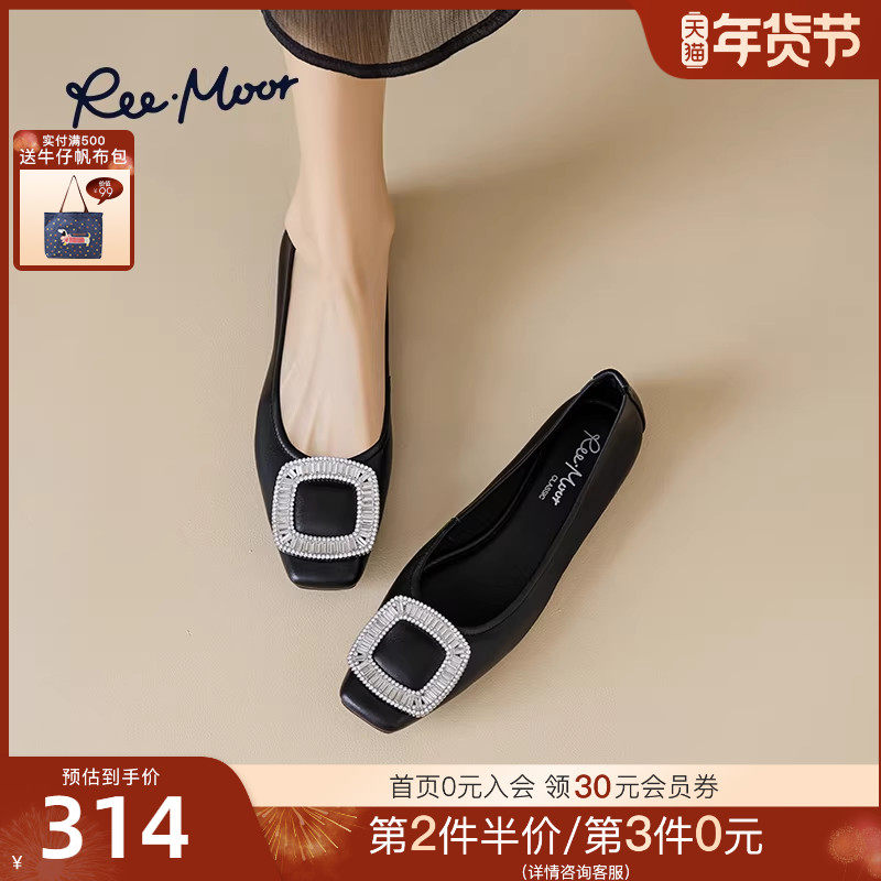 REEMOOR睿慕全羊皮舒适休闲方扣方头银色软底平底浅口单鞋船鞋女