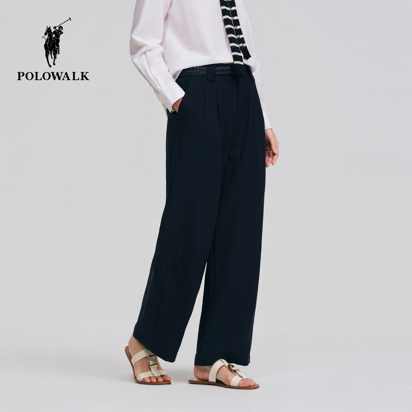 POLOWALK女式休闲裤2026春季新品亚麻混纺编织腰带直筒休闲长裤
