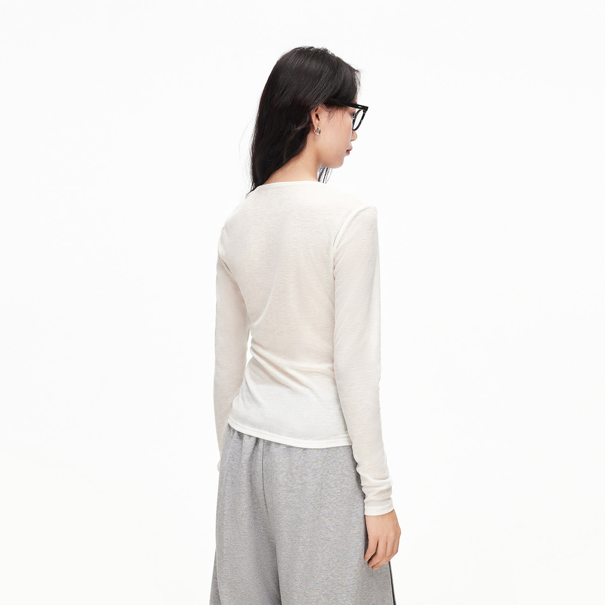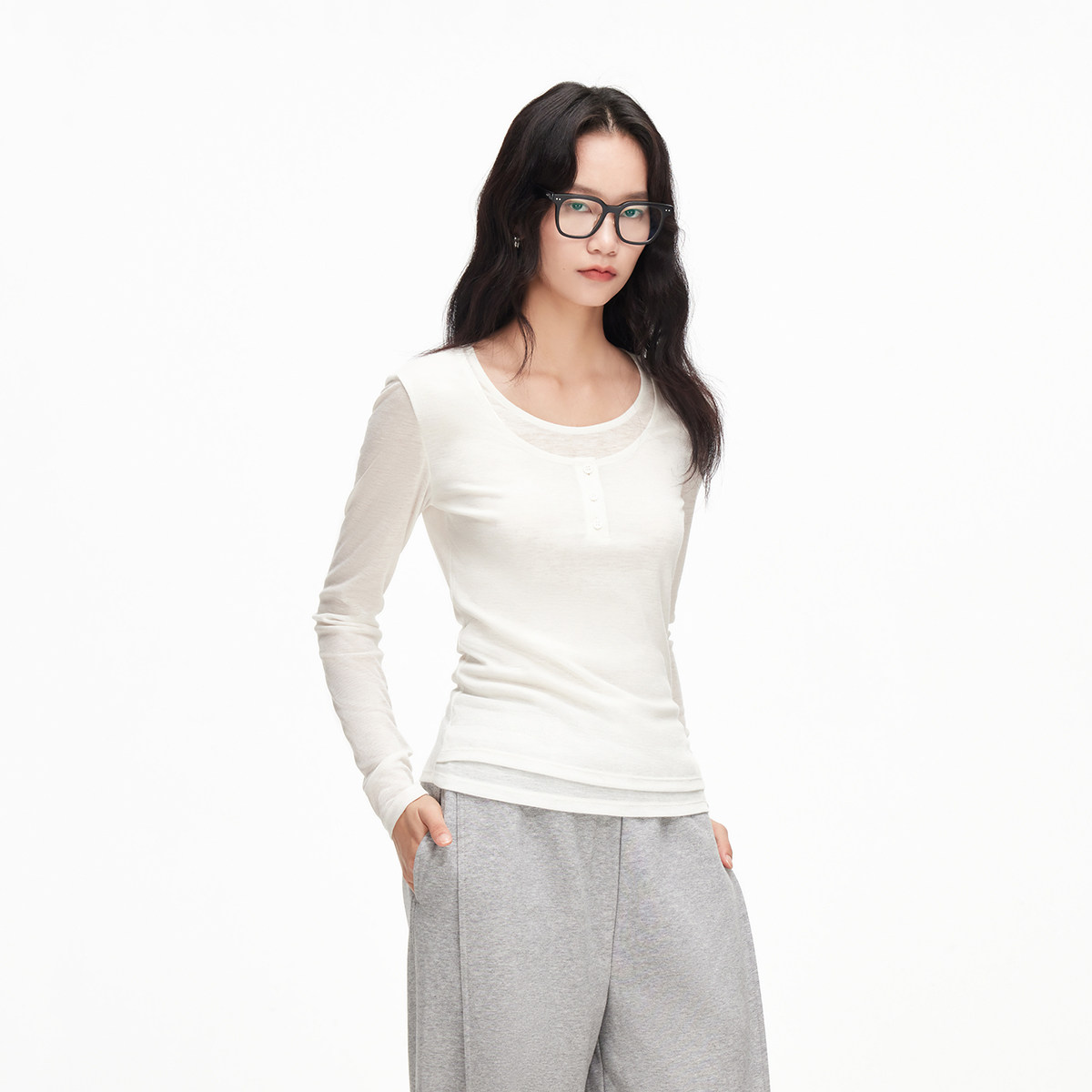 蕉下亨利衫女长袖T恤v领秋冬修身保暖低领打底衫半开领白色上衣