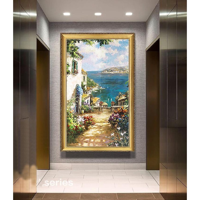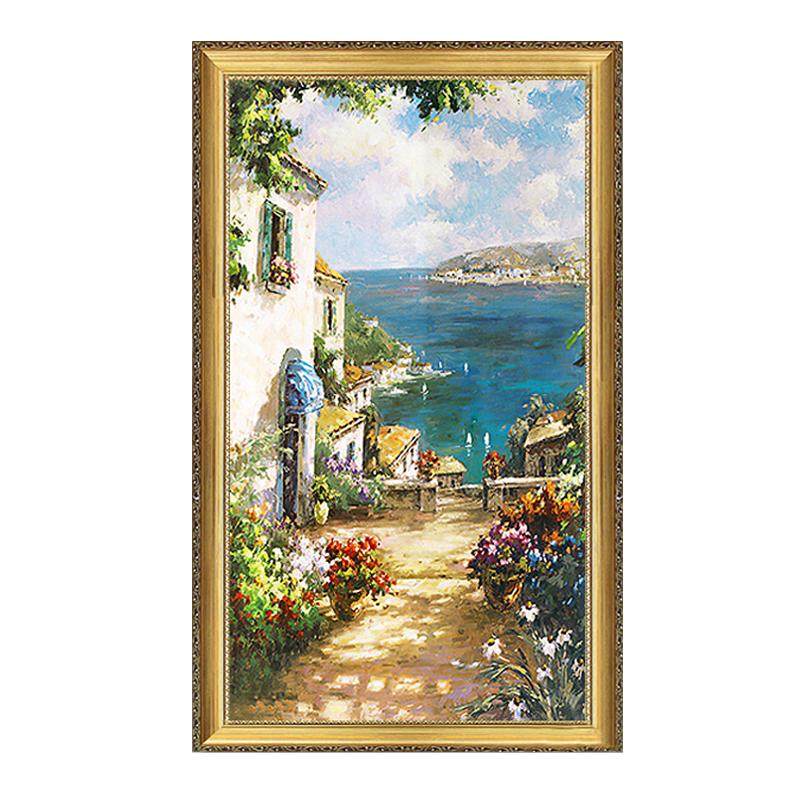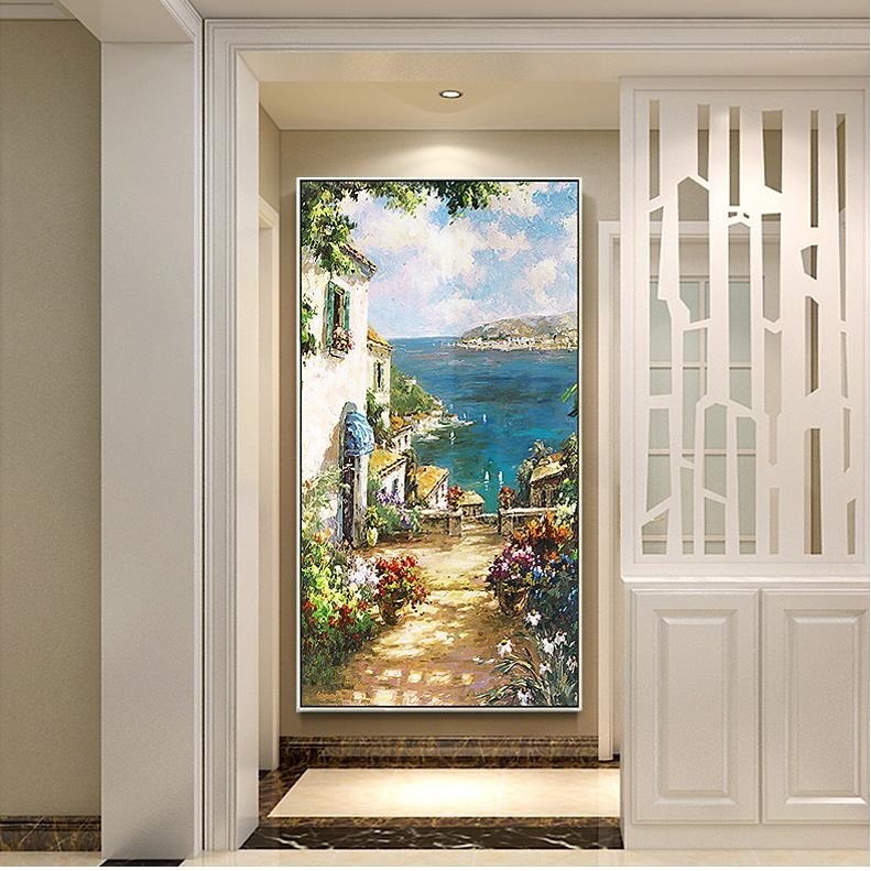 手绘油画地中海风景欧式客厅尽头挂画现代入门玄关走廊竖版装饰画