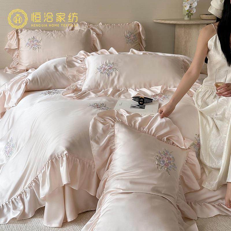 少女心透气丝滑莱赛尔四件套唯美花卉刺绣凉感夏季被套床品粉米色