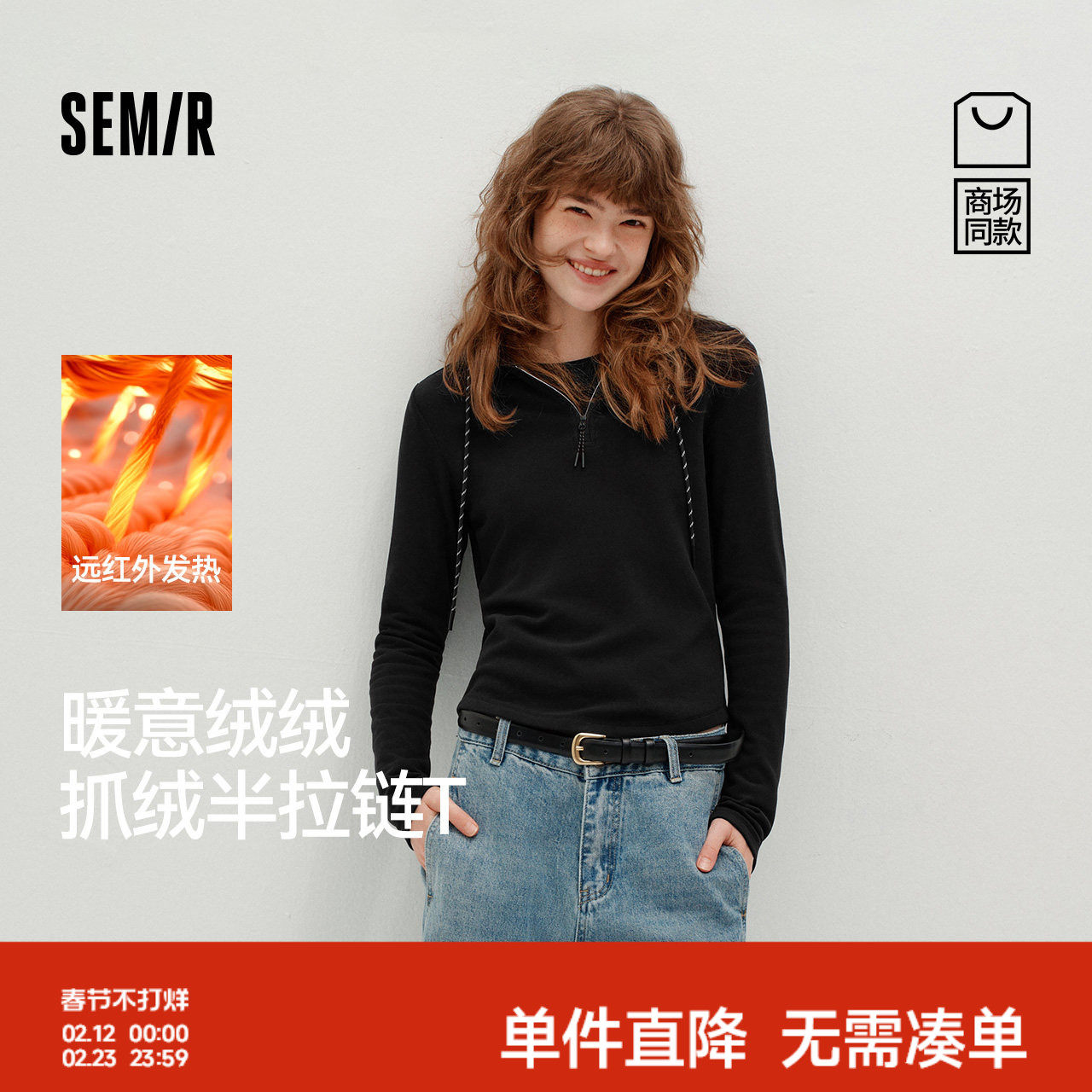 商场同款|森马长袖T恤女冬季半拉链连帽发热抓绒修身2025新款上衣