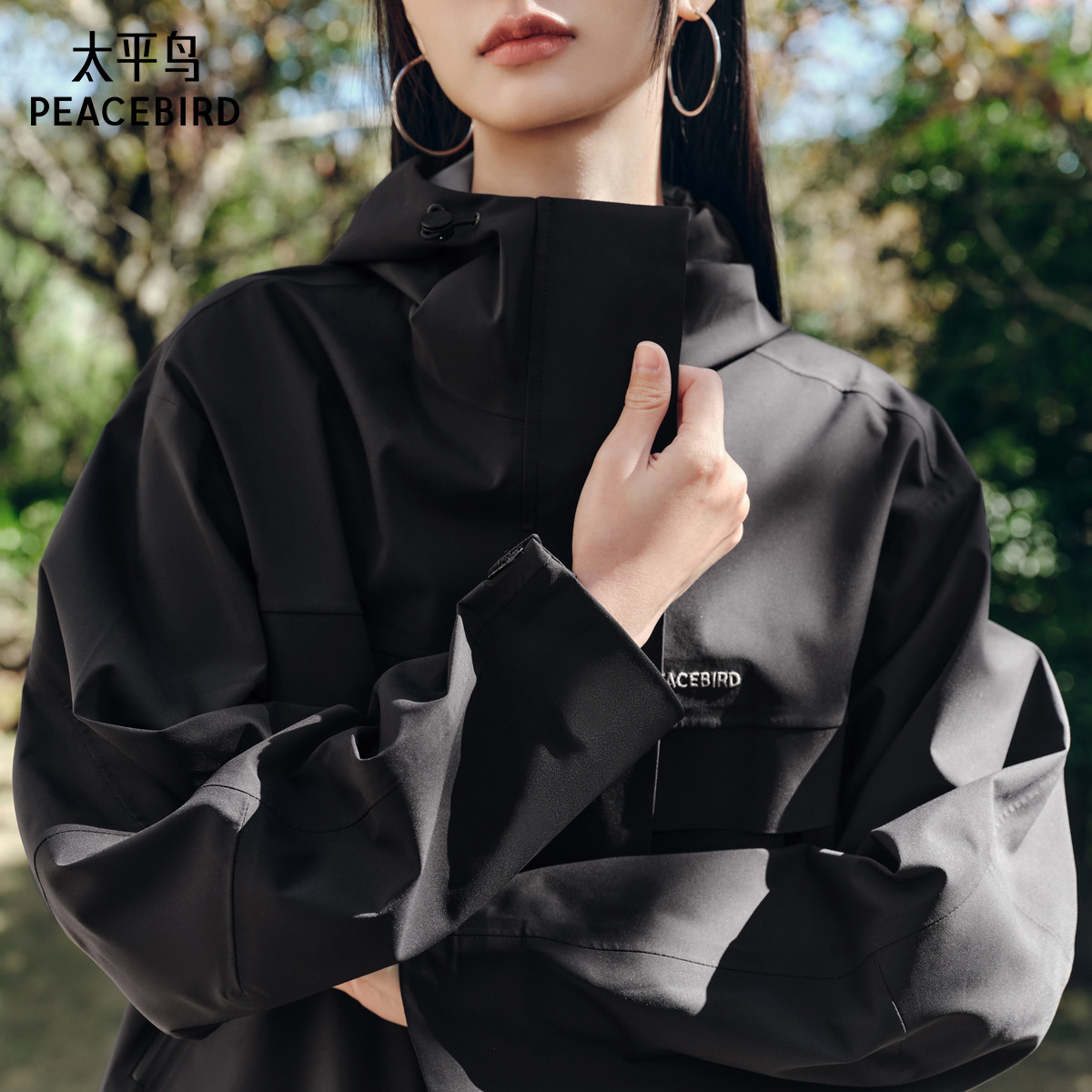 森马外套女连帽插肩袖宽松秋季潮流刺绣撞色夹克美式复古-TK