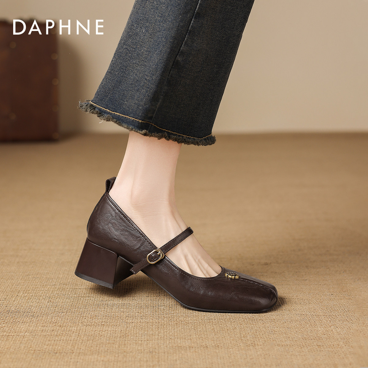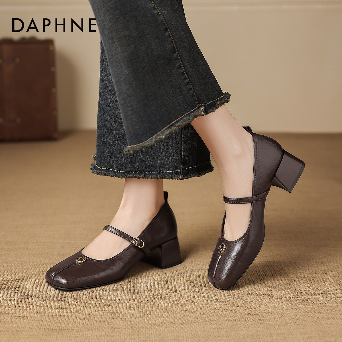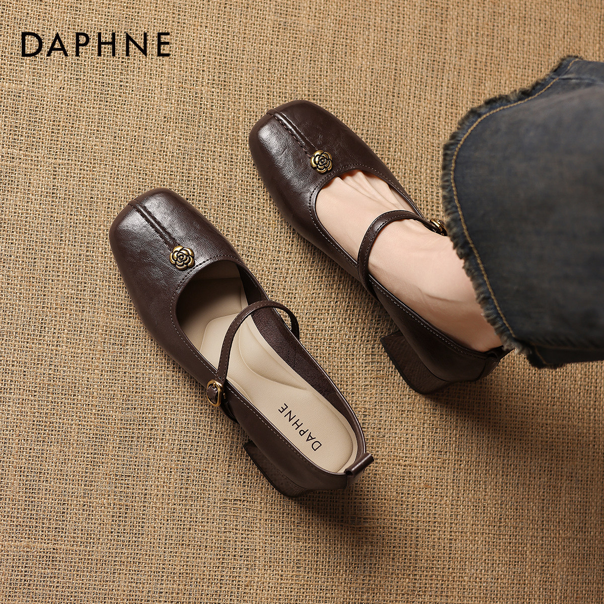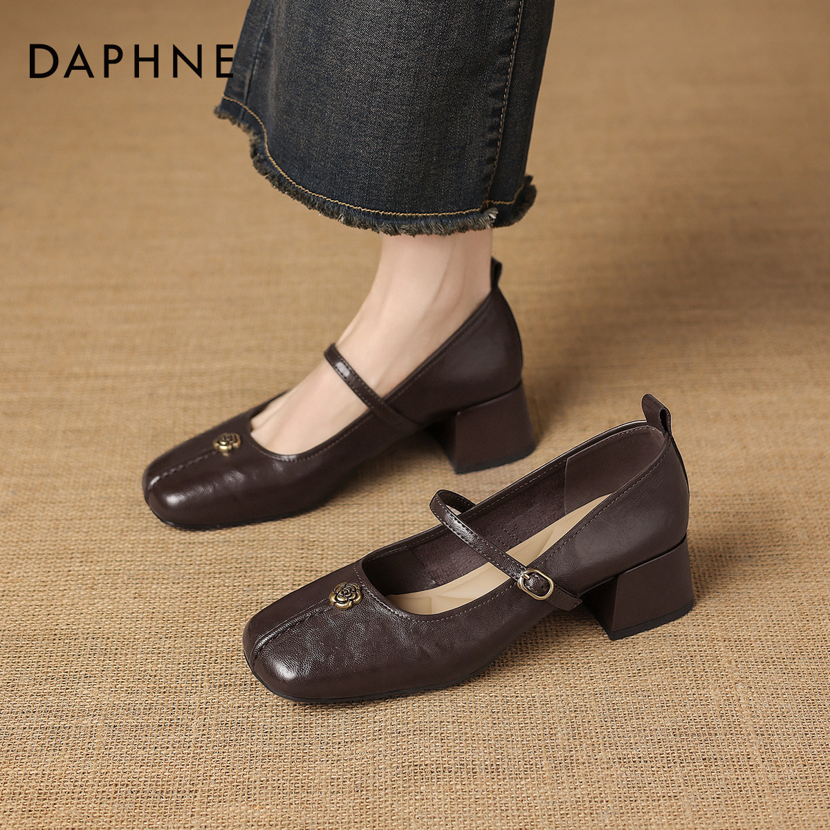 达芙妮高跟单鞋女2026新款春季复古山茶花方头粗跟玛丽珍小皮鞋子