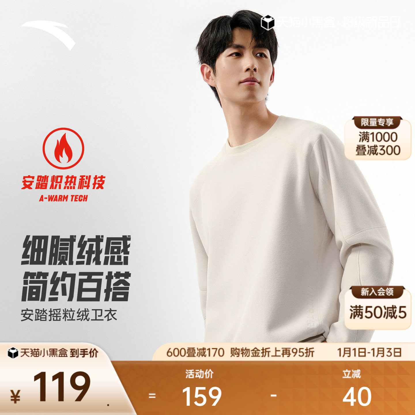 安踏加绒卫衣男保暖圆领套头衫男款2025冬季加厚宽松男士运动上衣
