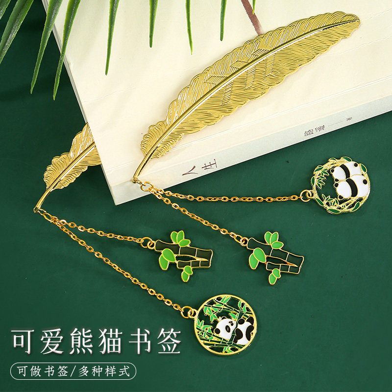 四川成都可爱熊猫金属黄铜羽毛镂空书签创意古典中国风文创纪念品