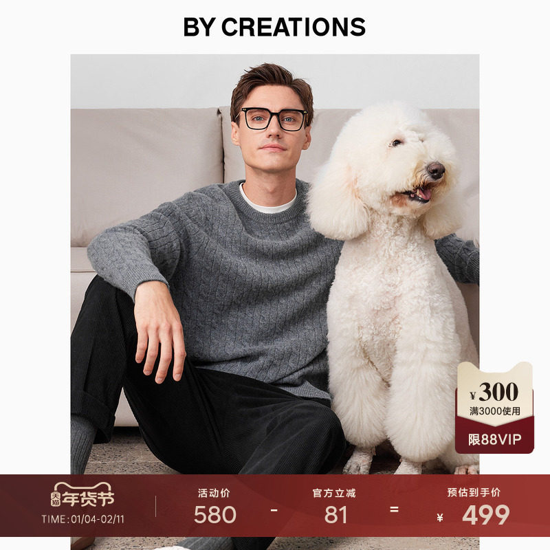 柏品纯羊毛圆领毛衣男士宽松百搭商务休闲绞花肌理通勤针织衫上衣