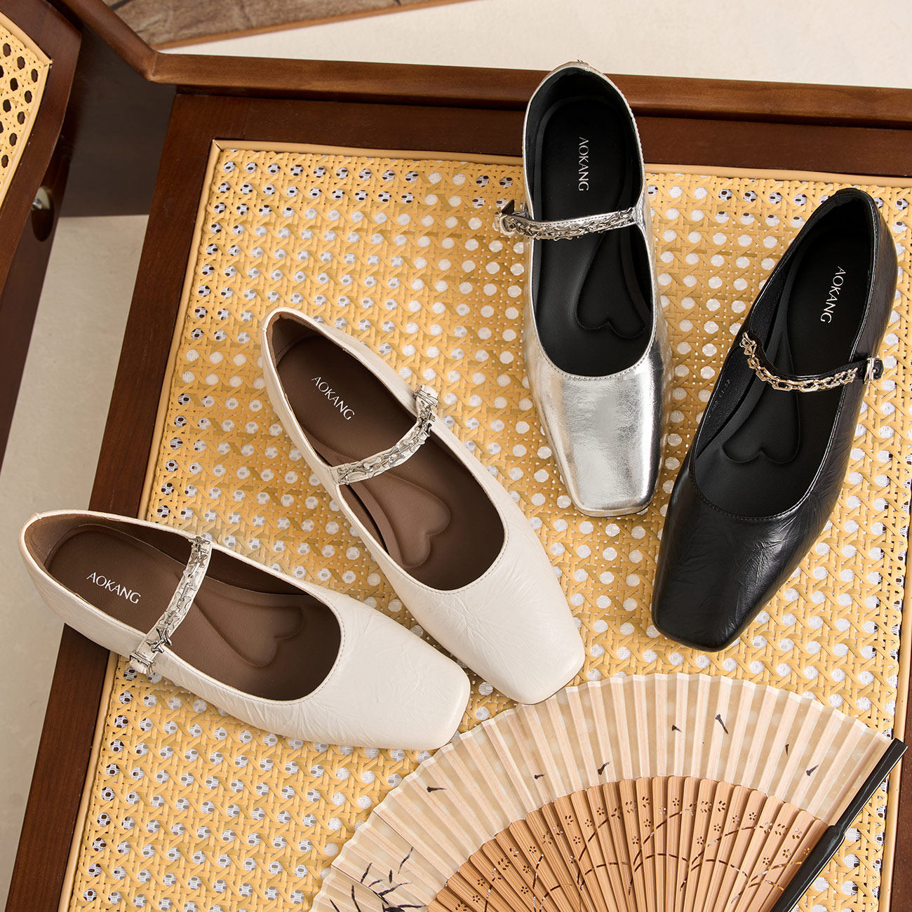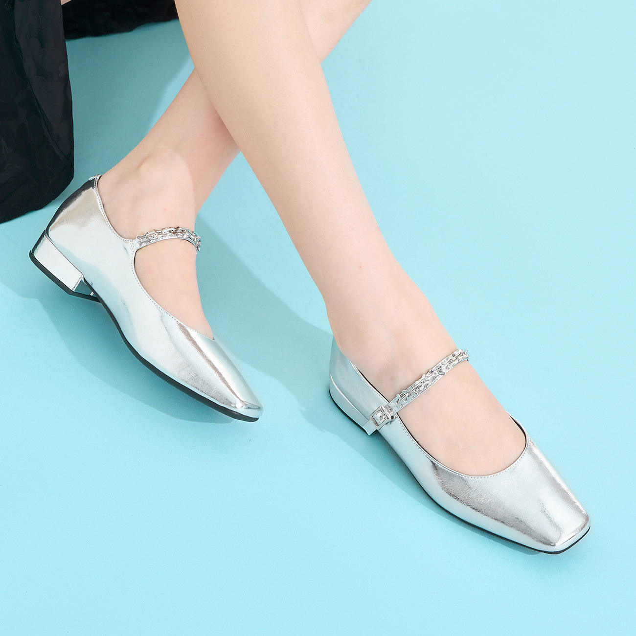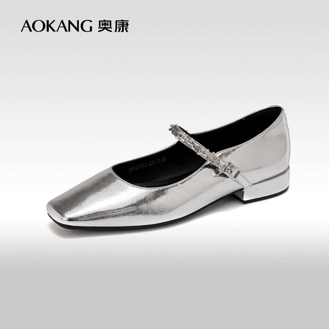奥康银色玛丽珍鞋春秋新款时尚方头金属粗跟法式平底浅口单鞋女