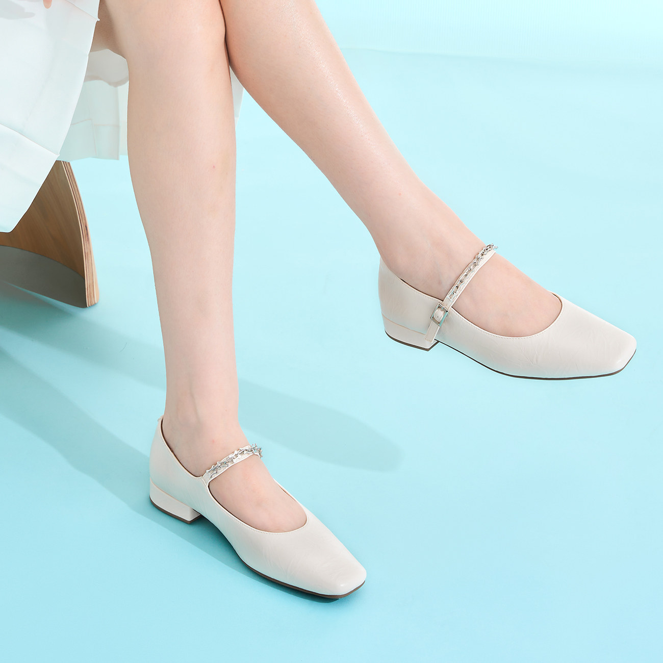 六点大叔真皮粗跟单鞋女2025春季新款珍珠伴娘白色高跟鞋玛丽珍鞋