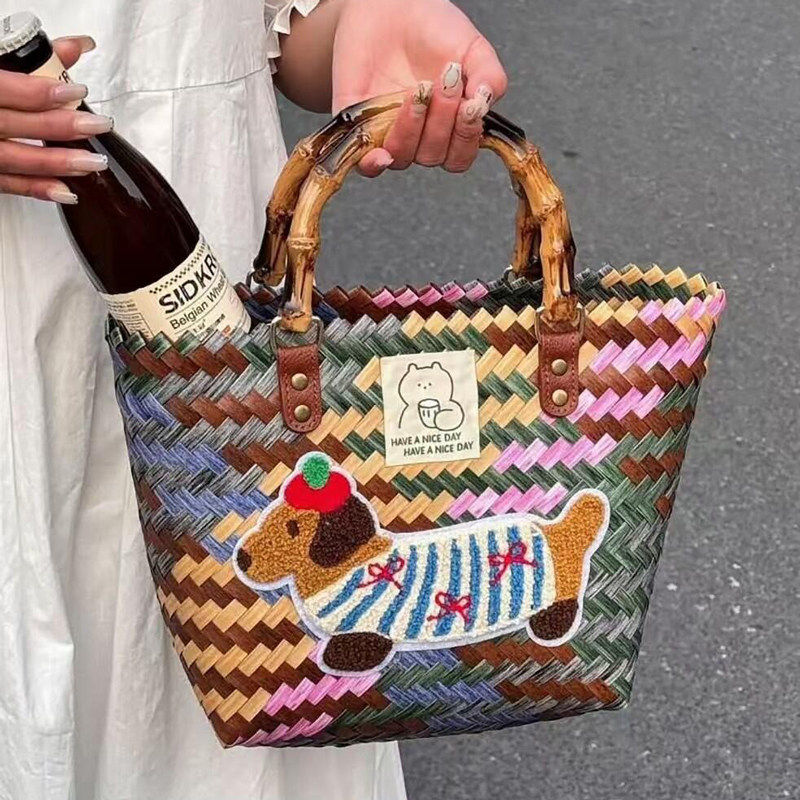 腊肠狗编织包菜篮子复古藤编手提包竹节草编包纯手工竹编包沙滩包
