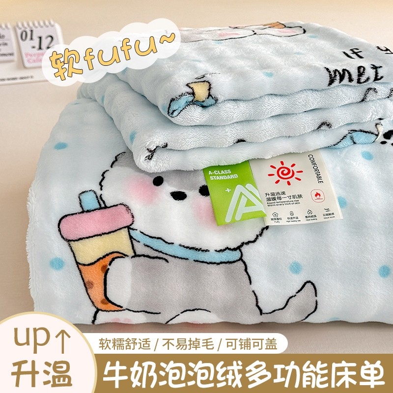花花公子A类加厚牛奶绒床单单件泡泡绒冬季宿舍毛绒毯子三件套