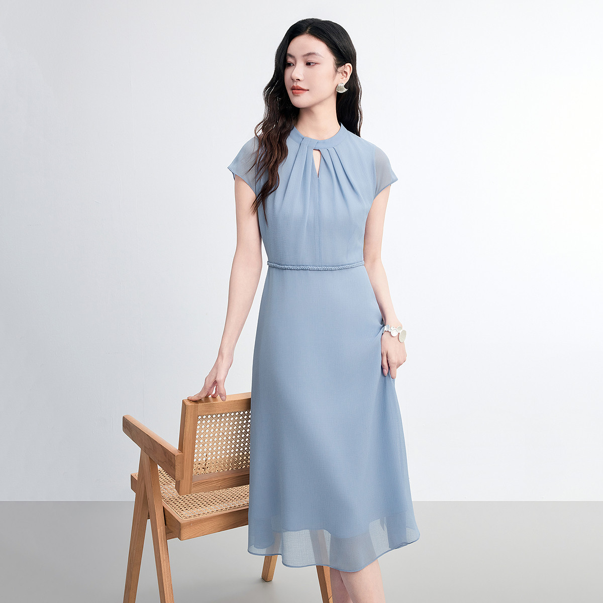 【热销补货】欧时力 褶皱短袖连衣裙女2026春新款收腰显瘦小黑裙