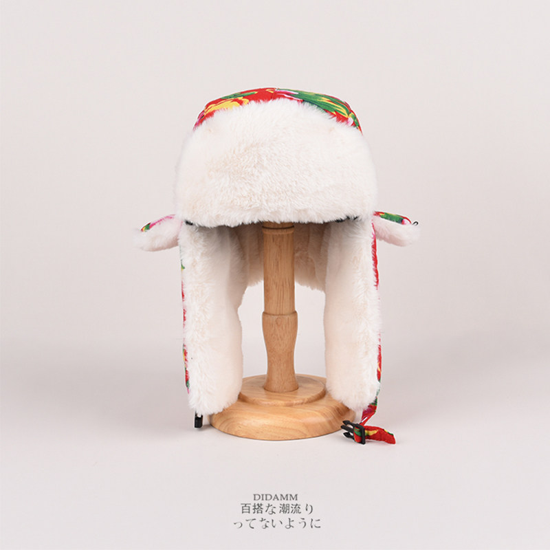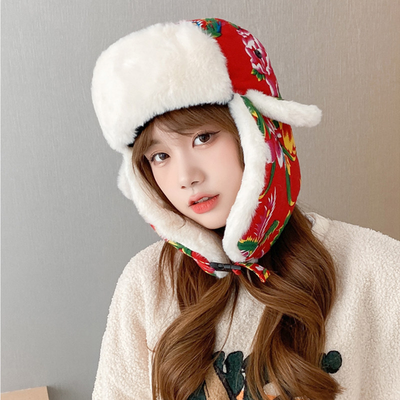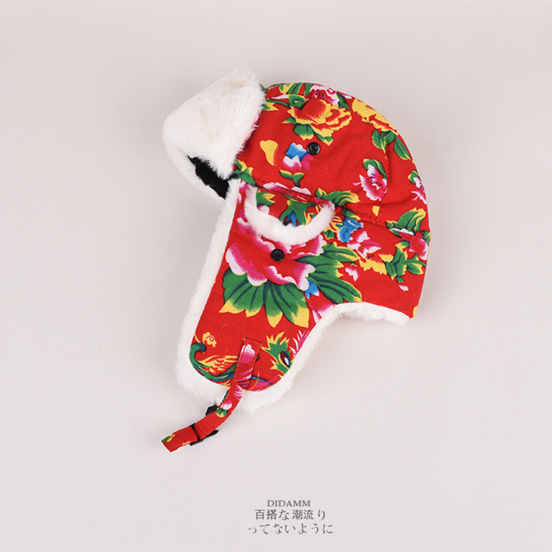 东北大花帽子男女冬季民族风复古花布加绒护耳棉帽防寒雷锋帽防风