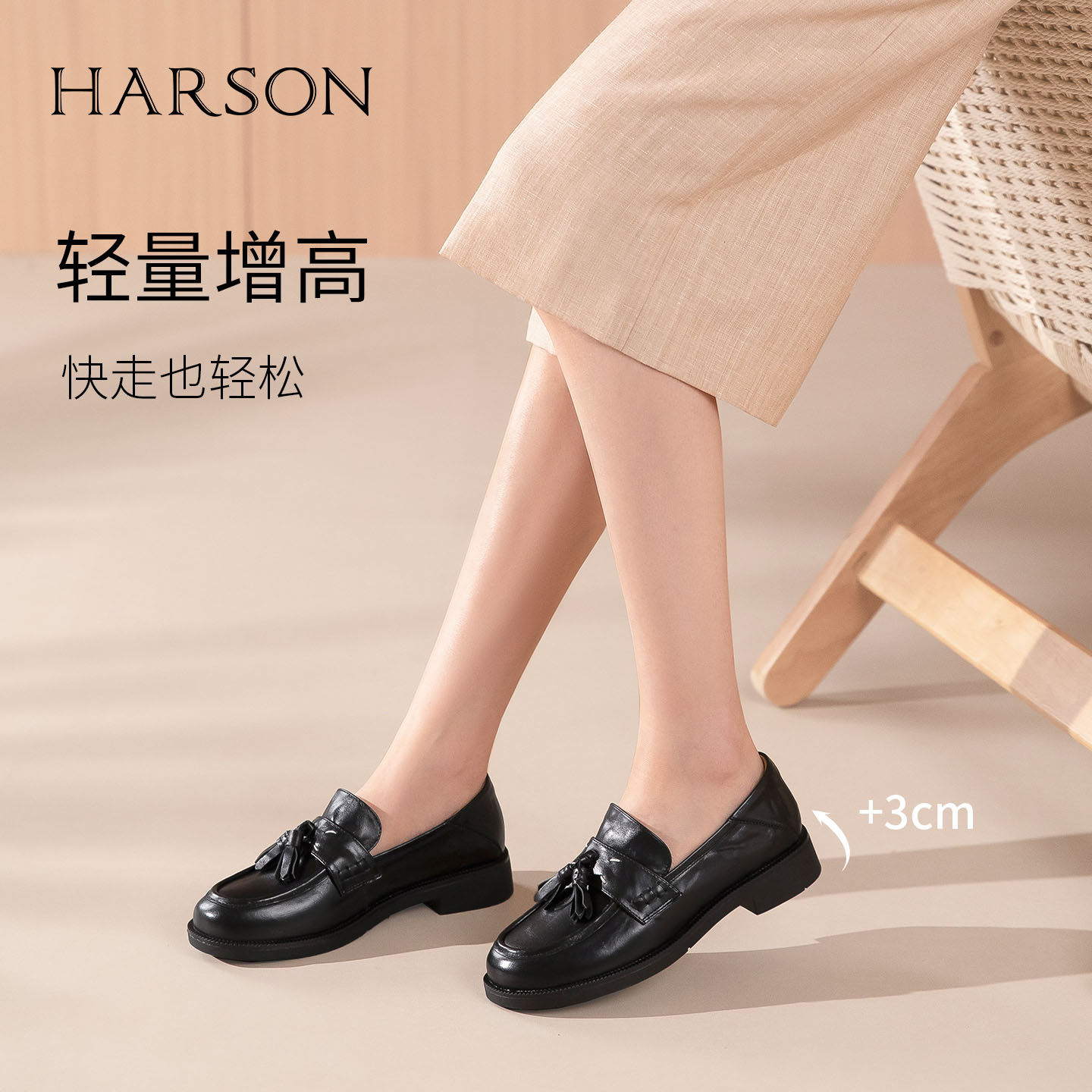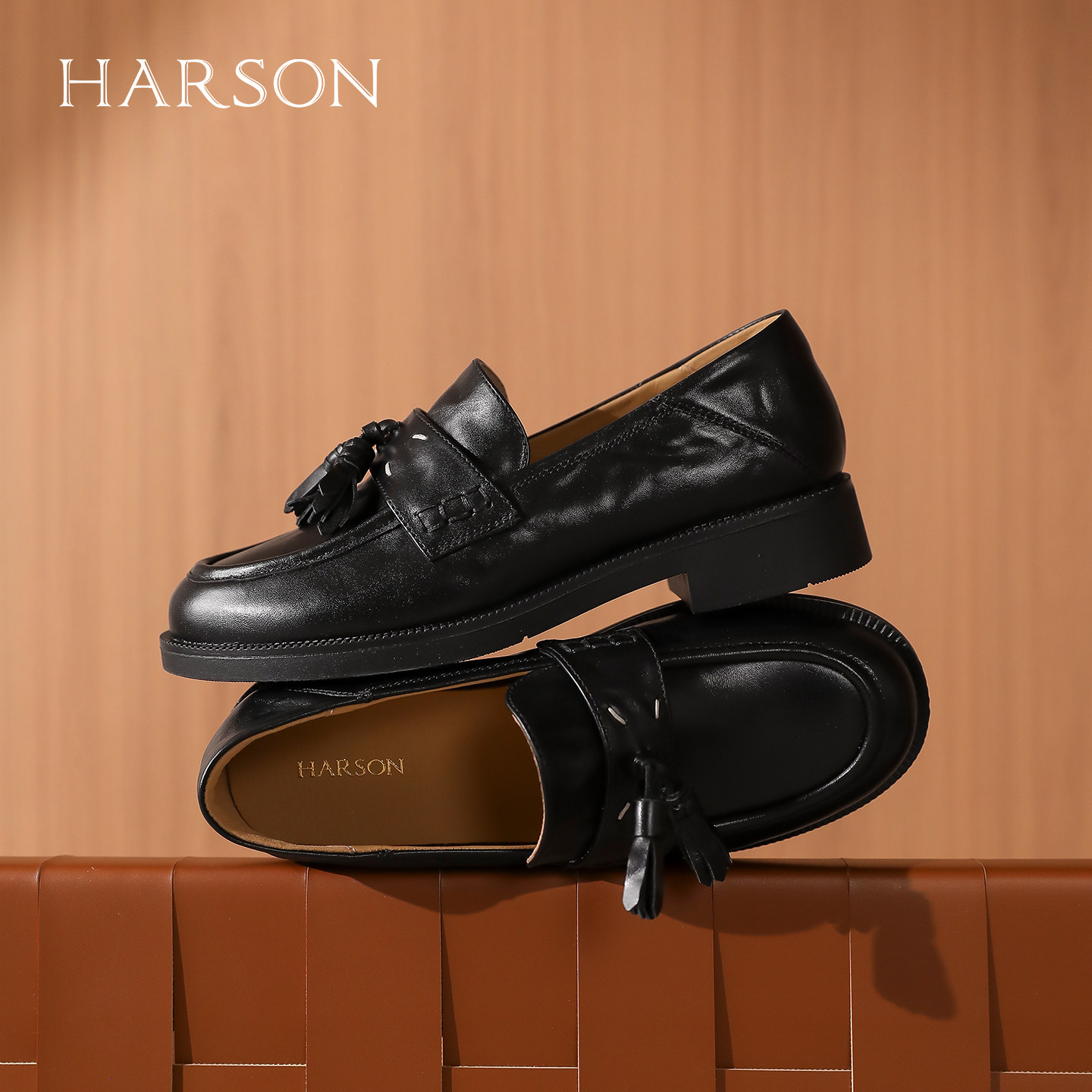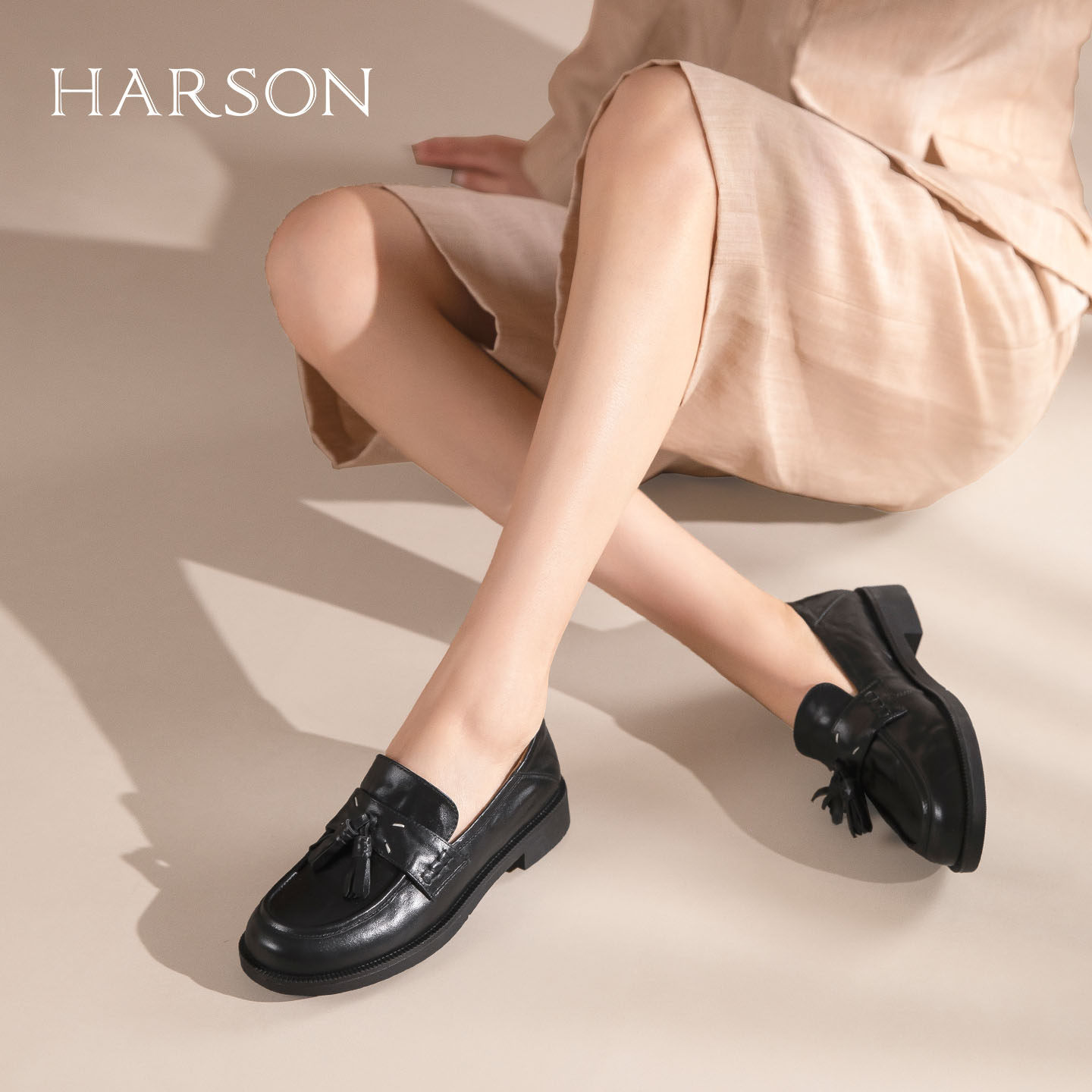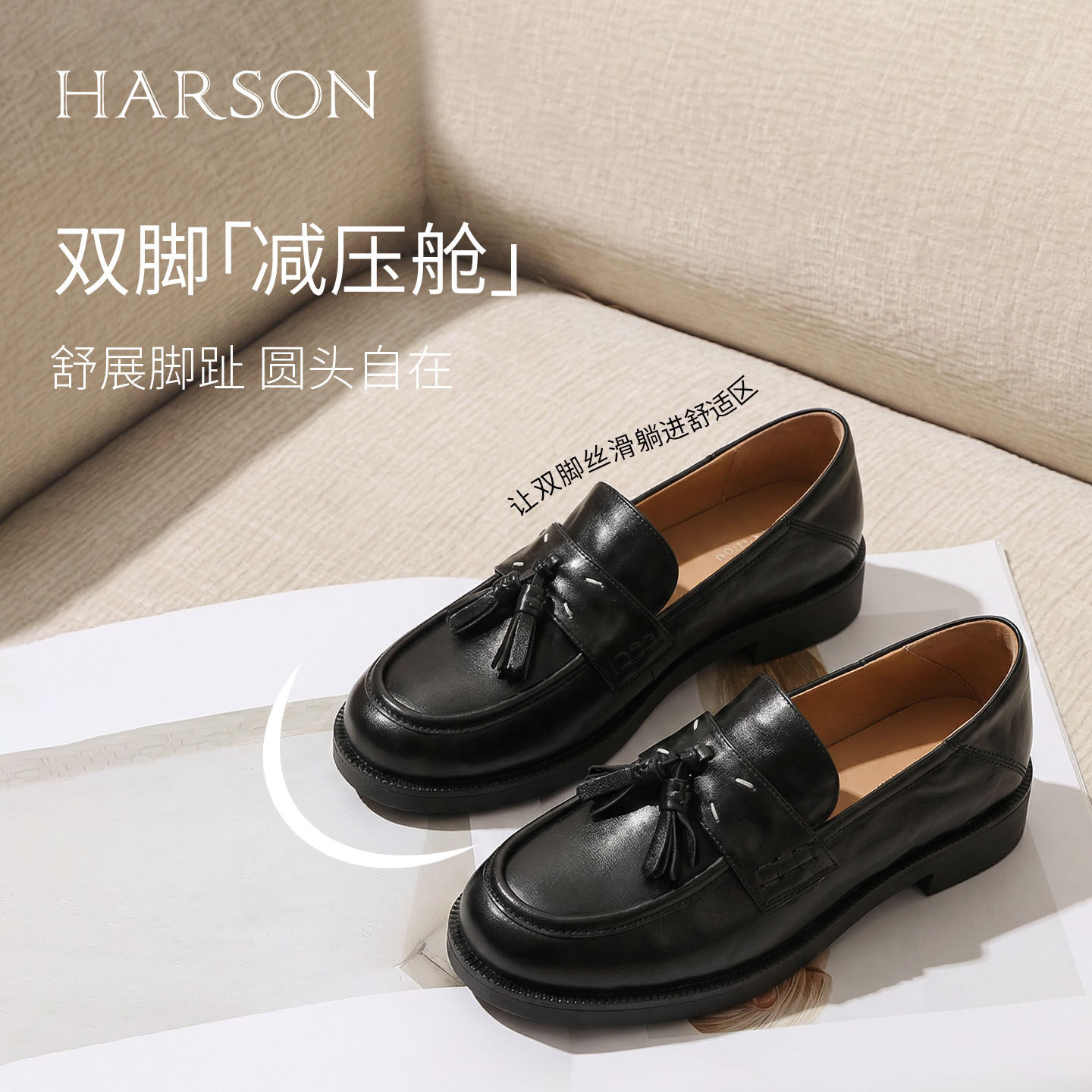 哈森/HARSON【优雅黑贝蒂】26春新款黑色真皮流苏乐福鞋英伦皮鞋