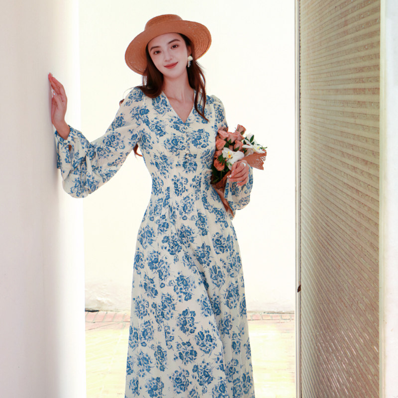 早秋新款复古国风收腰显瘦大摆长裙女连衣裙长袖青花瓷绑带印花裙