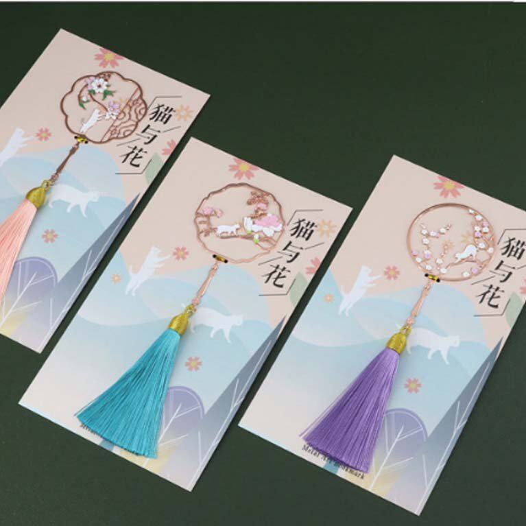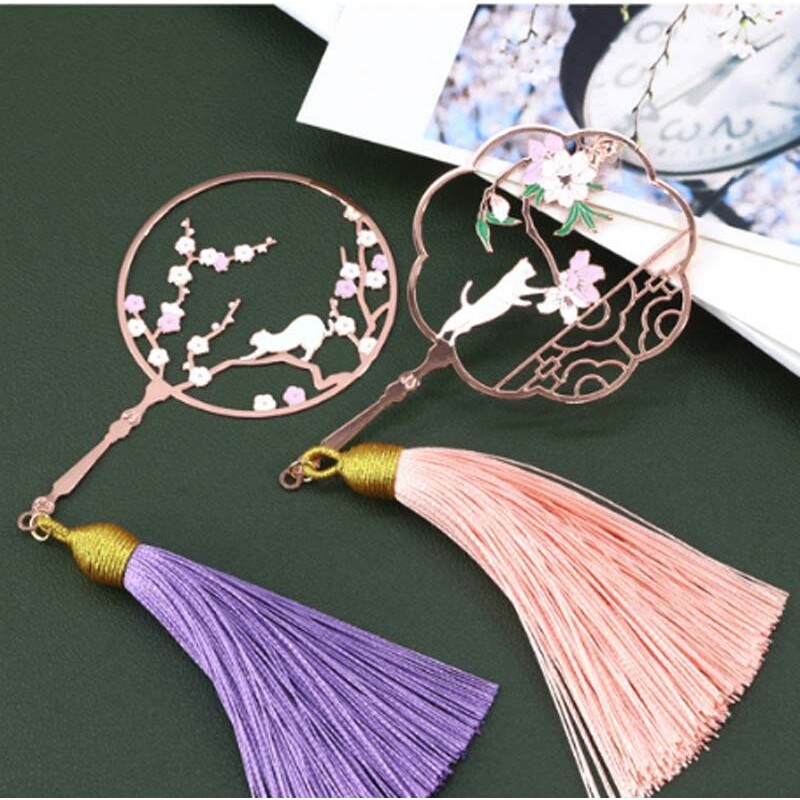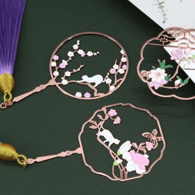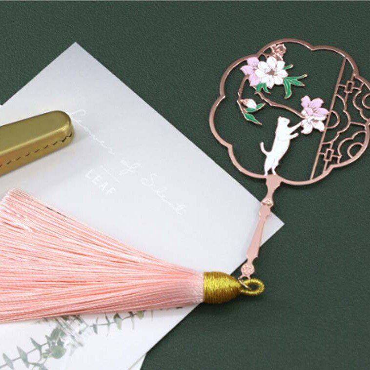 猫与花彩扇金属艺术书签古风文创团扇流苏送师友礼品故宫风文创