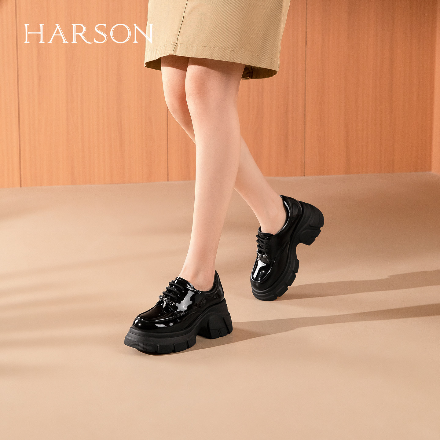 哈森时尚黑色圆头厚底乐福鞋真皮百搭通勤单鞋2026春新款HL267101
