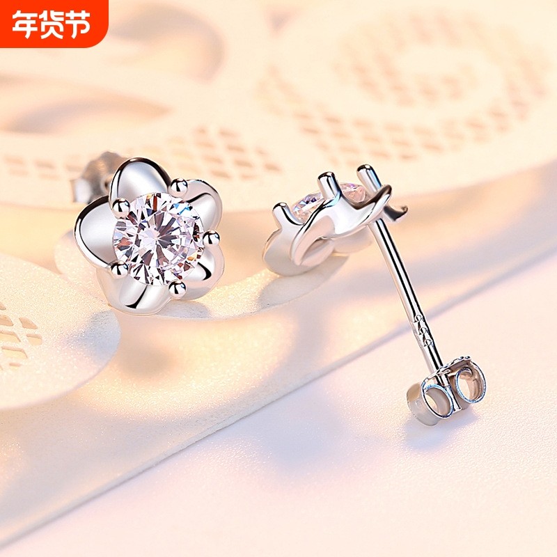 S925纯银耳钉樱花瑞士钻女款韩版小清新镶钻时尚银饰品一件代发