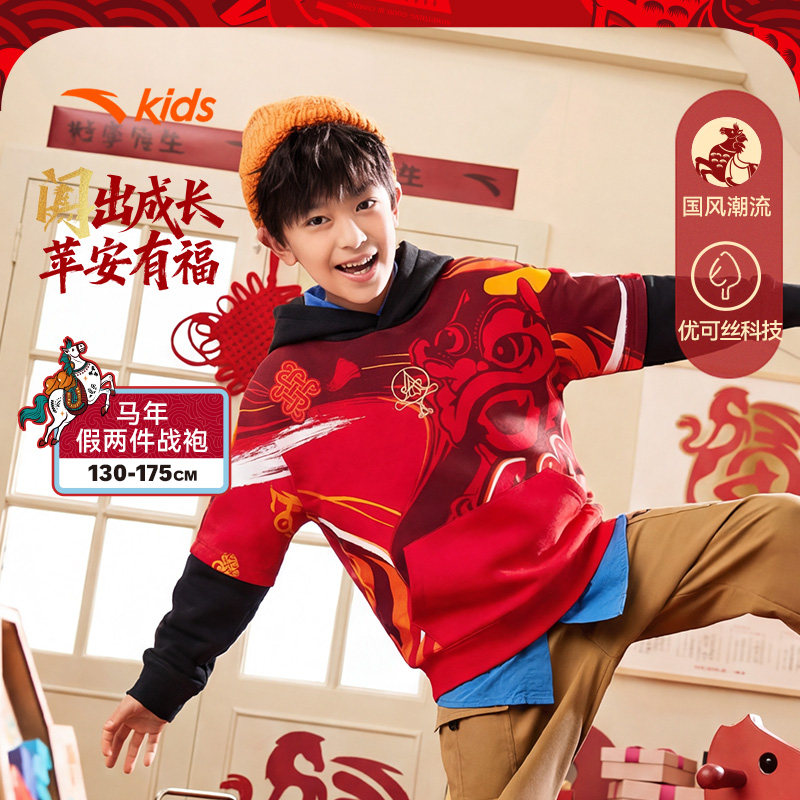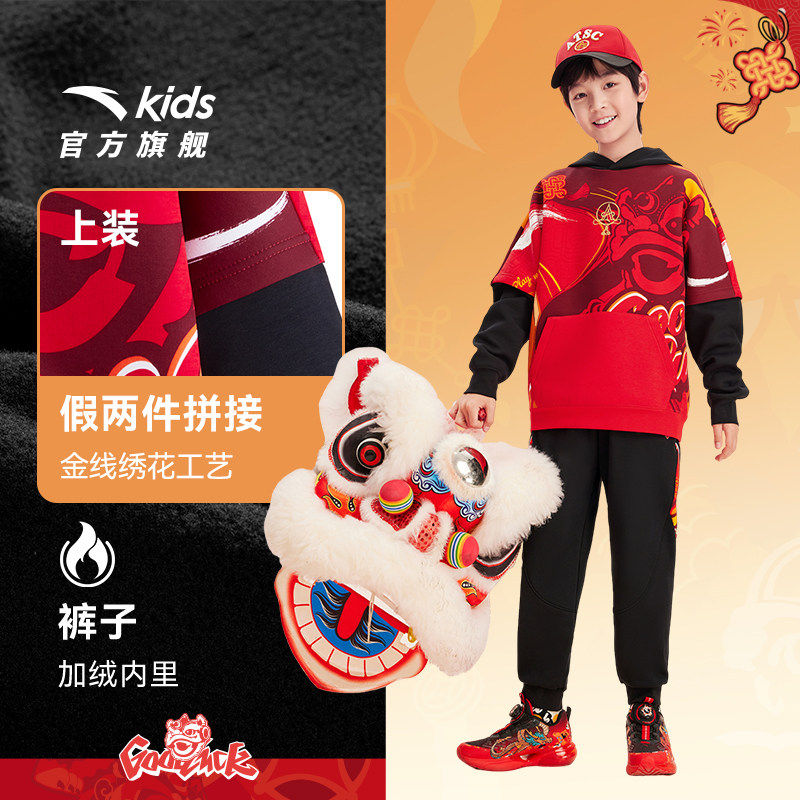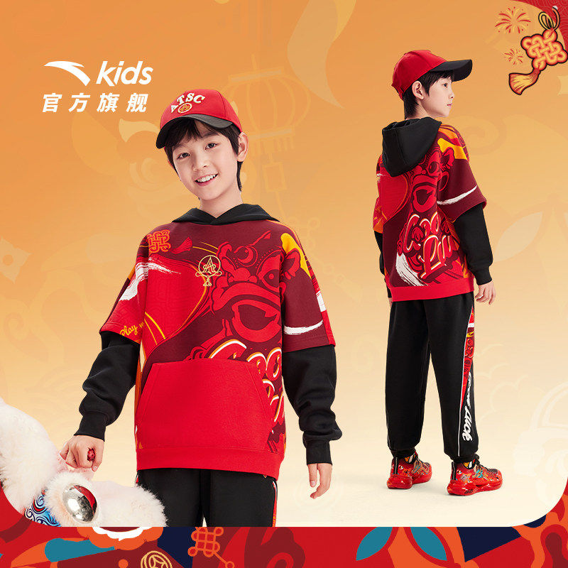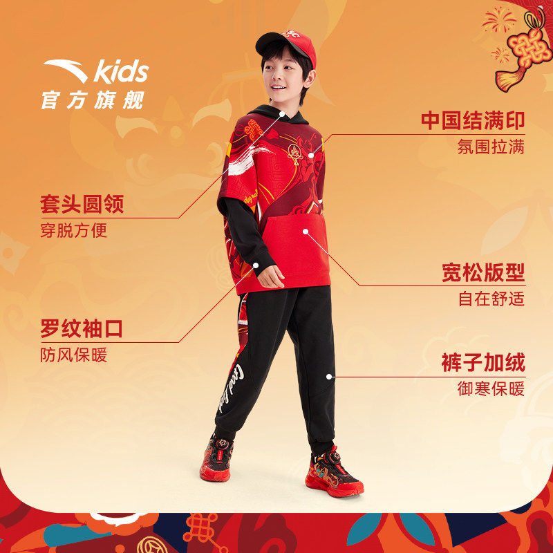 安踏儿童新年套装男童套头衫卫衣裤子2026春季新款红色拜年服