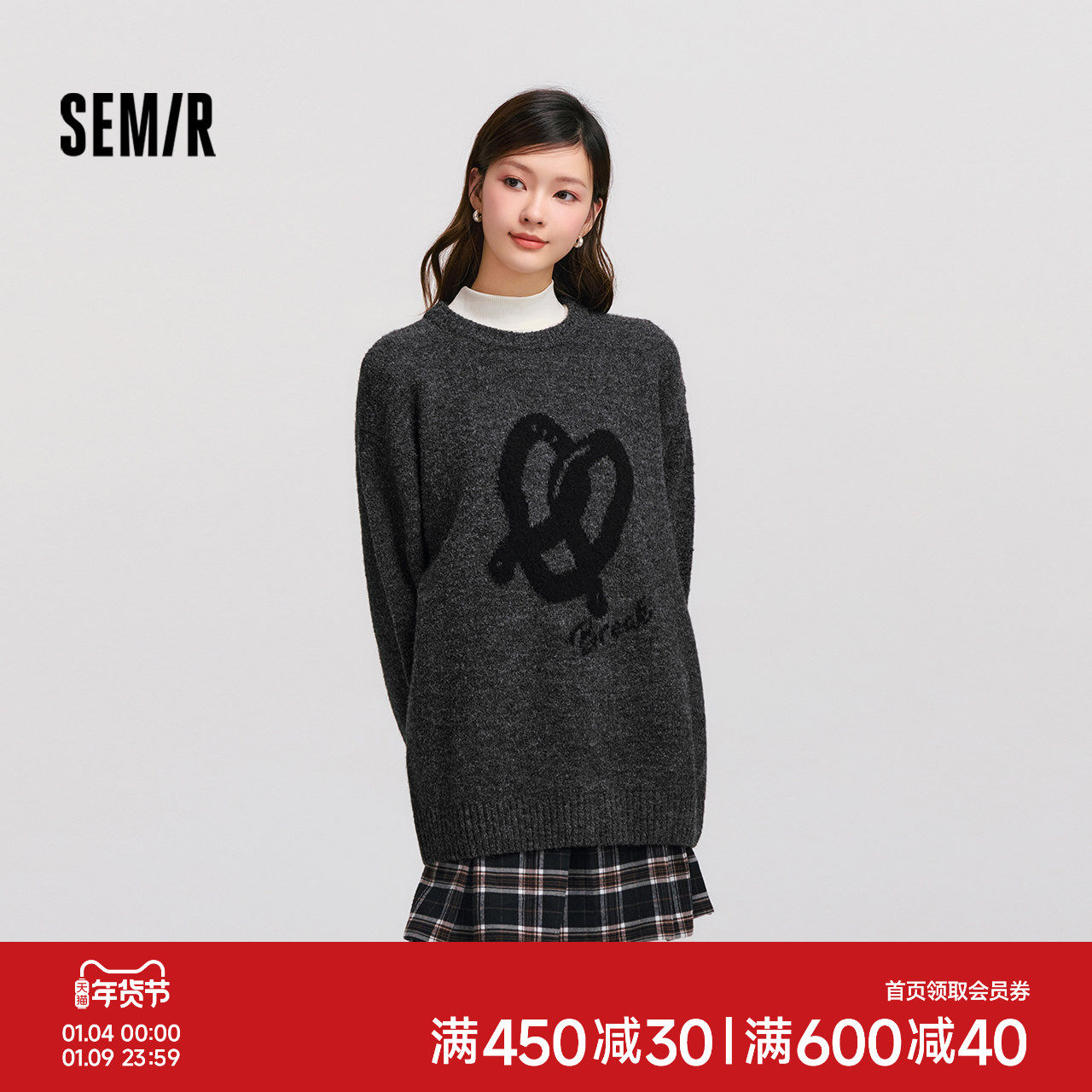 森马毛衣女中长款宽松落肩圆领毛衫休闲慵懒2024新款冬季提花衣服