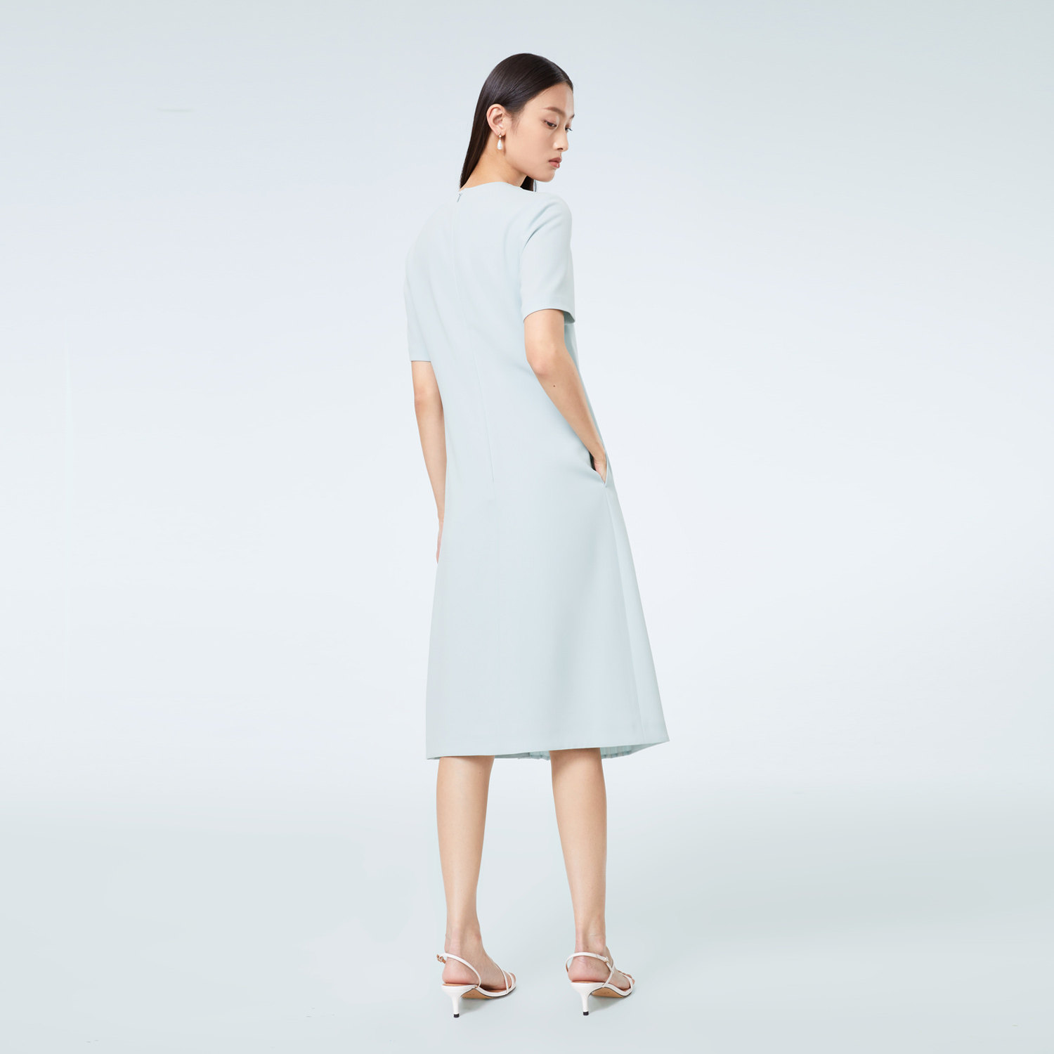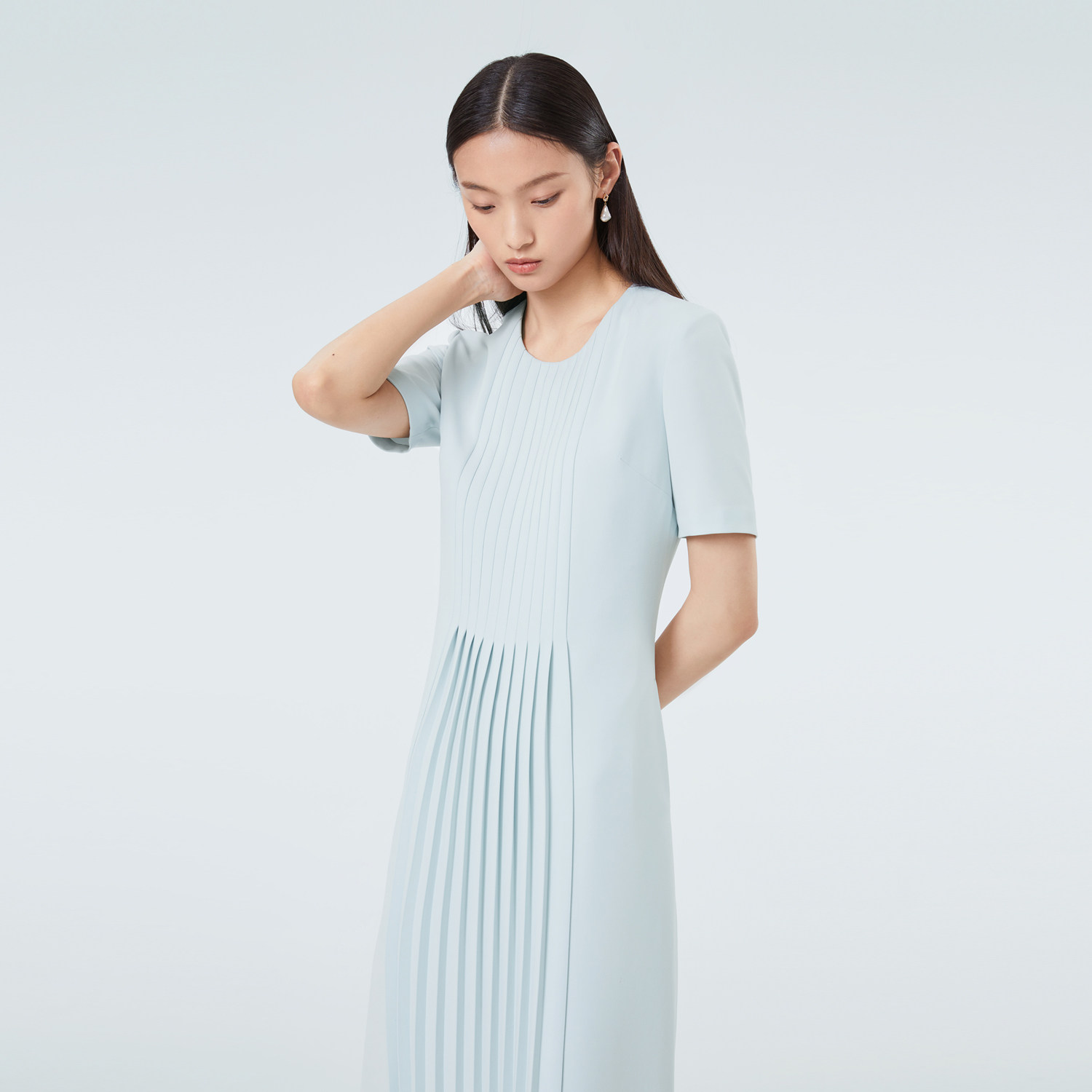 OVVOutlet 春夏热卖女装单面缎三醋酸经典圆领清爽百褶短袖连衣裙