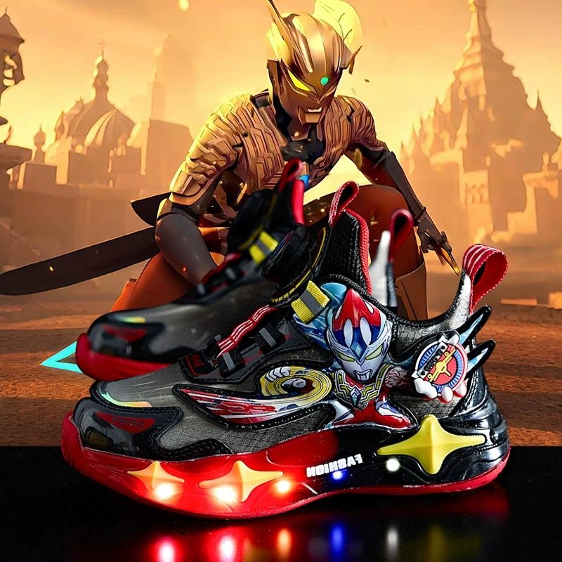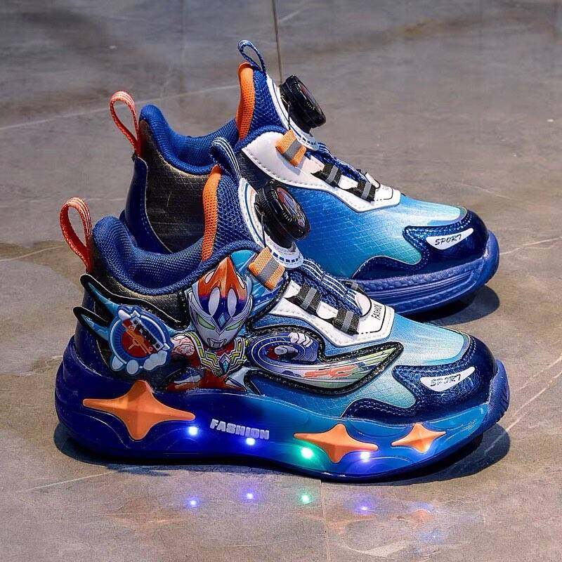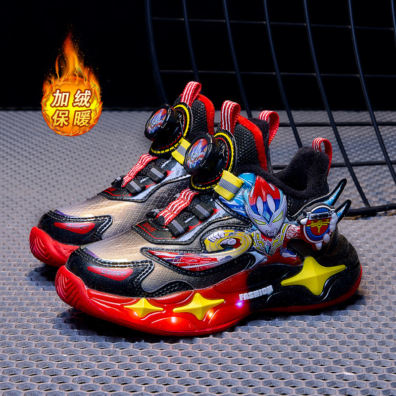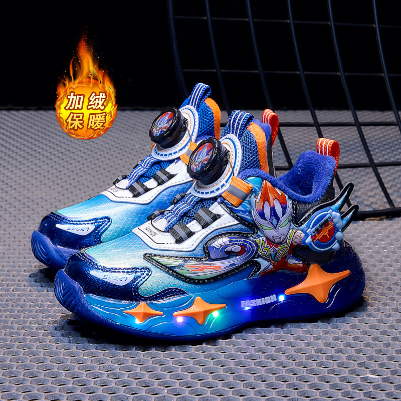 巴布豆真皮奥特男童曼鞋加绒保暖新款冬季儿童发光亮灯运动老爹鞋