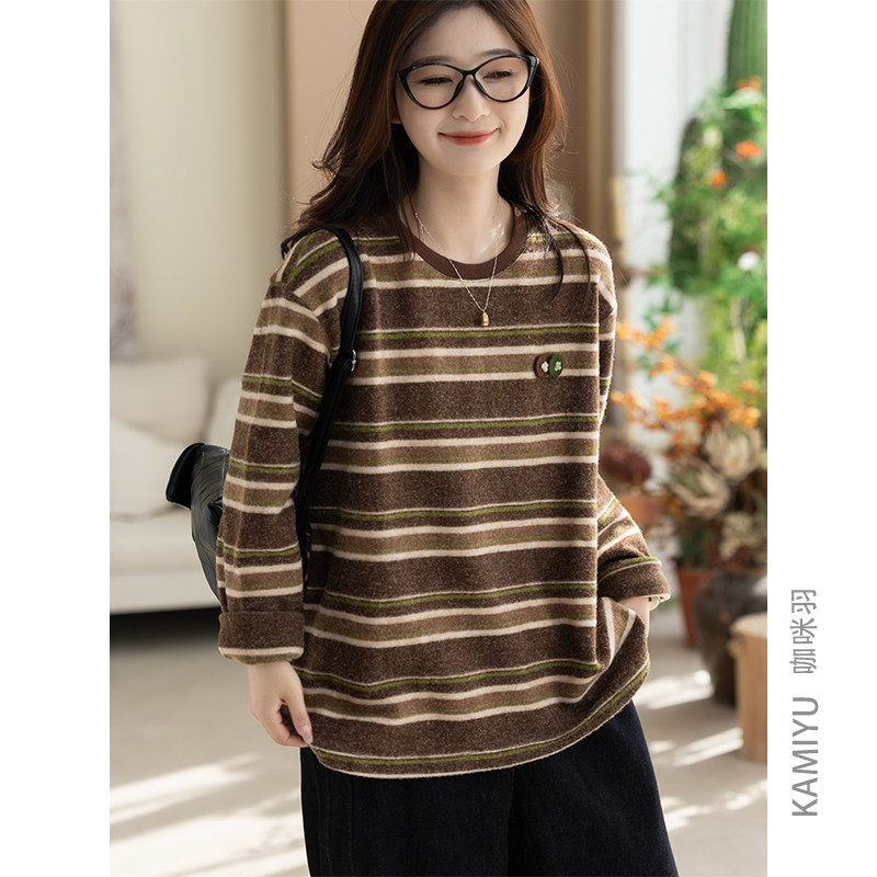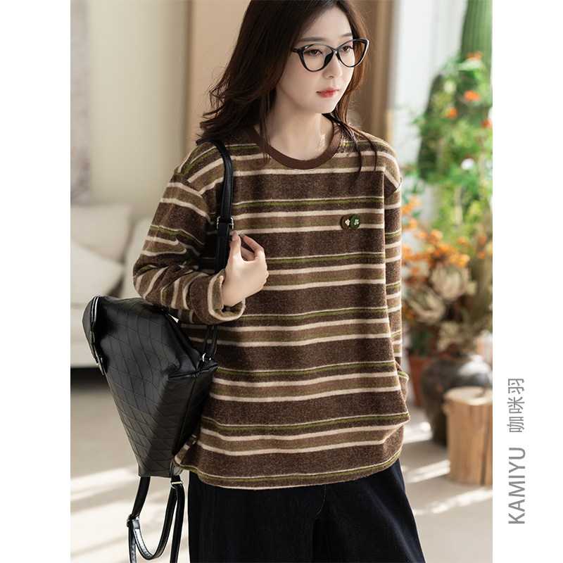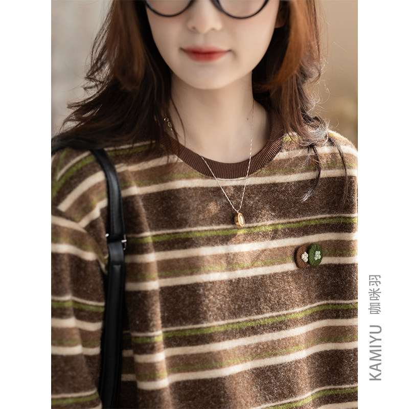 咖咪羽打底衫女秋冬新款文艺休闲流行女士条纹百搭复古女款上衣