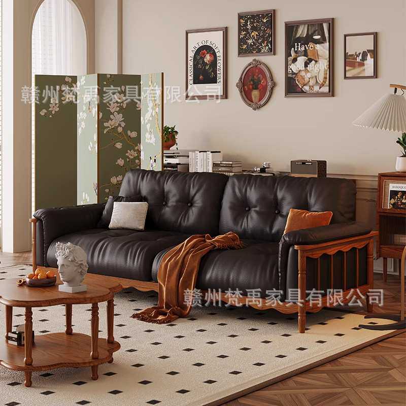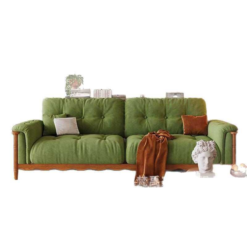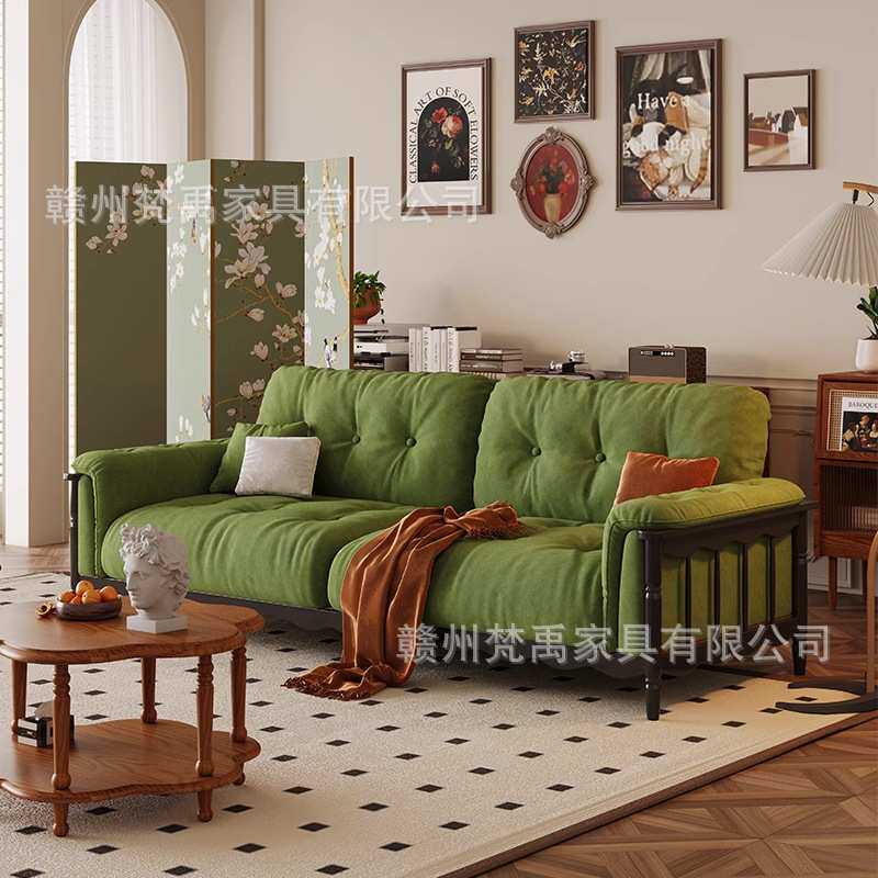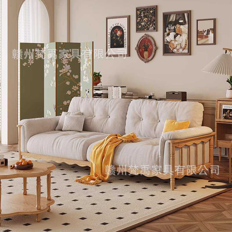 法式复古实木婴儿绒布艺沙发客厅中古风三人位直排油蜡皮云朵沙发