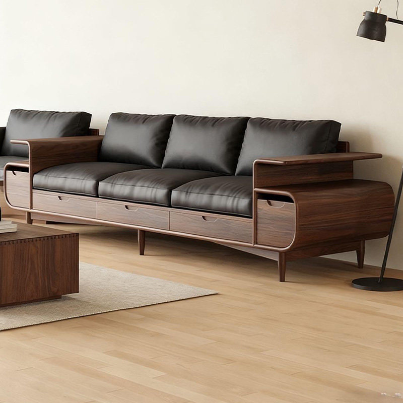 新中式实木沙发宋式美学2025新款高端北美黑胡桃木真皮直排沙发