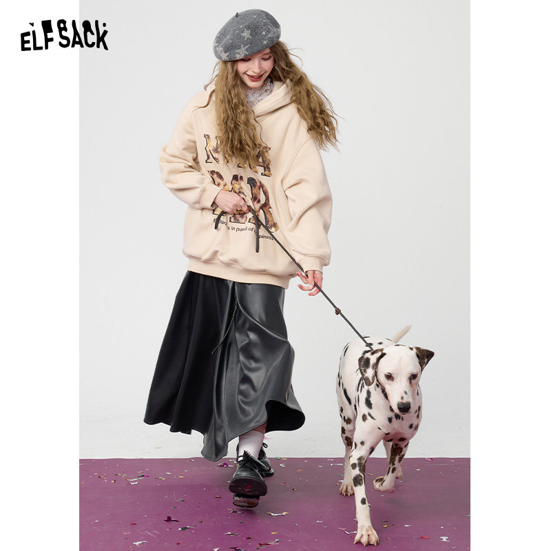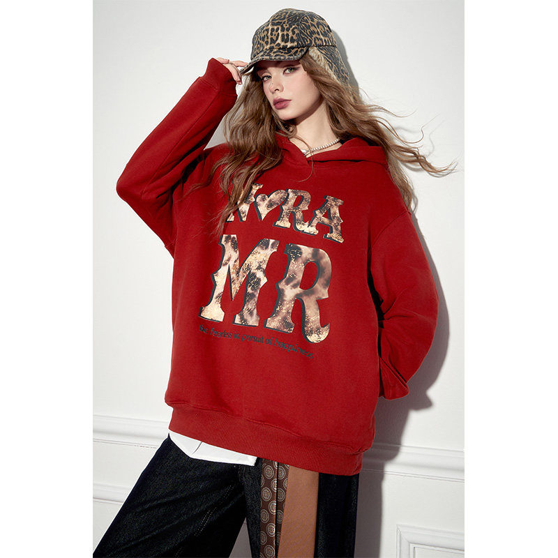 妖精的口袋红色豹纹印花加绒连帽卫衣女2025冬新款宽松休闲上衣