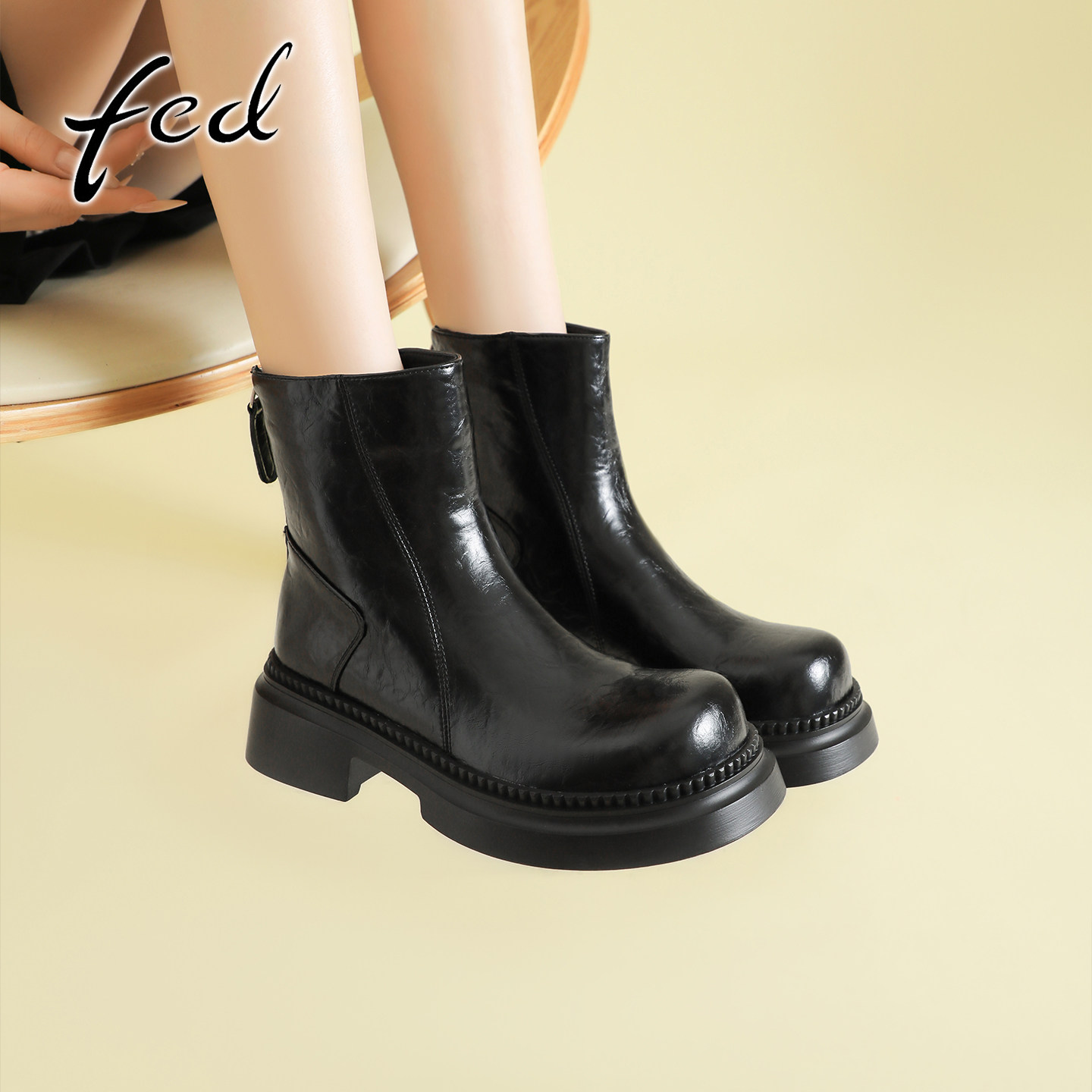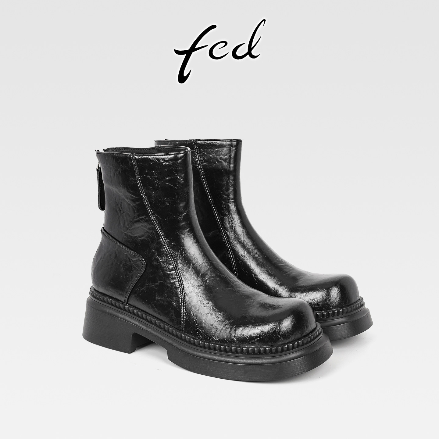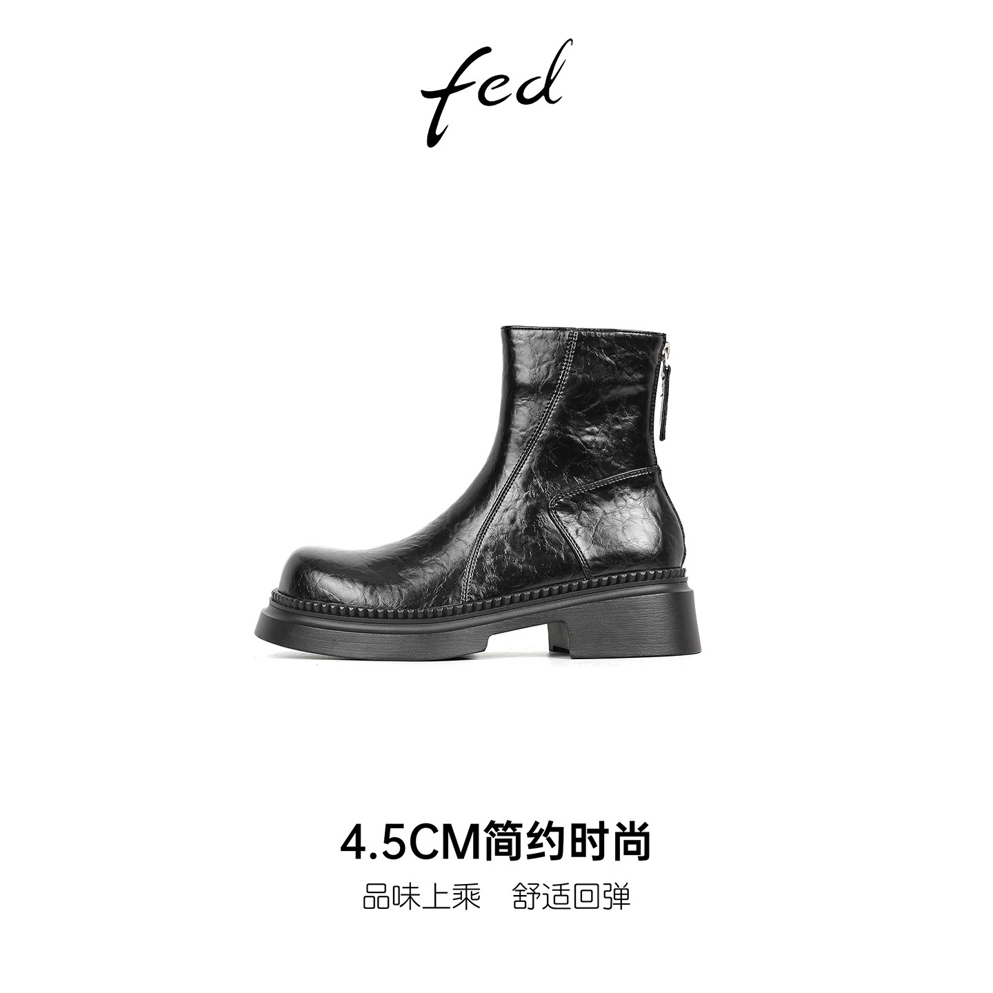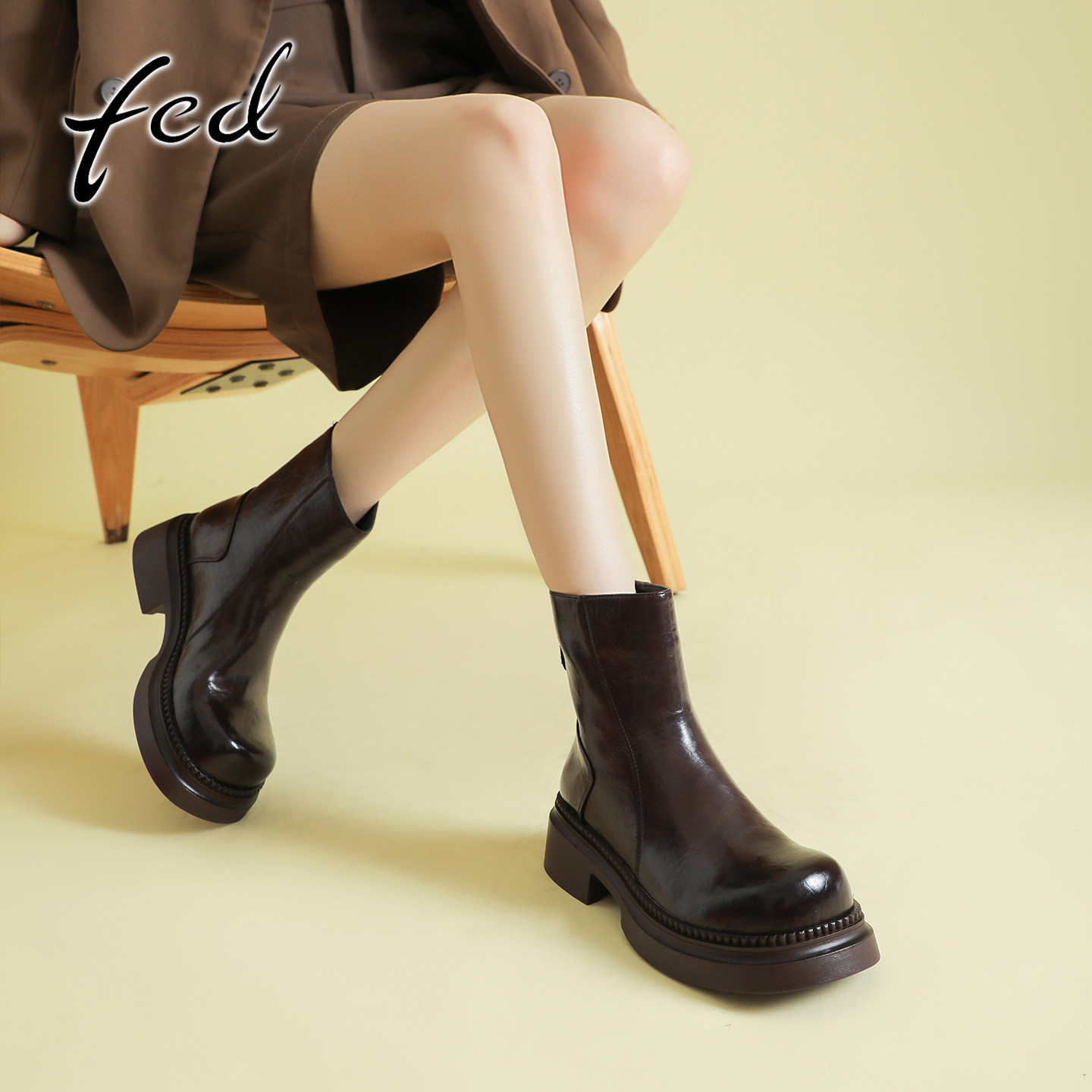 fed复古真皮粗跟厚底马丁靴女秋冬新款后拉链中跟圆头瘦瘦小短靴
