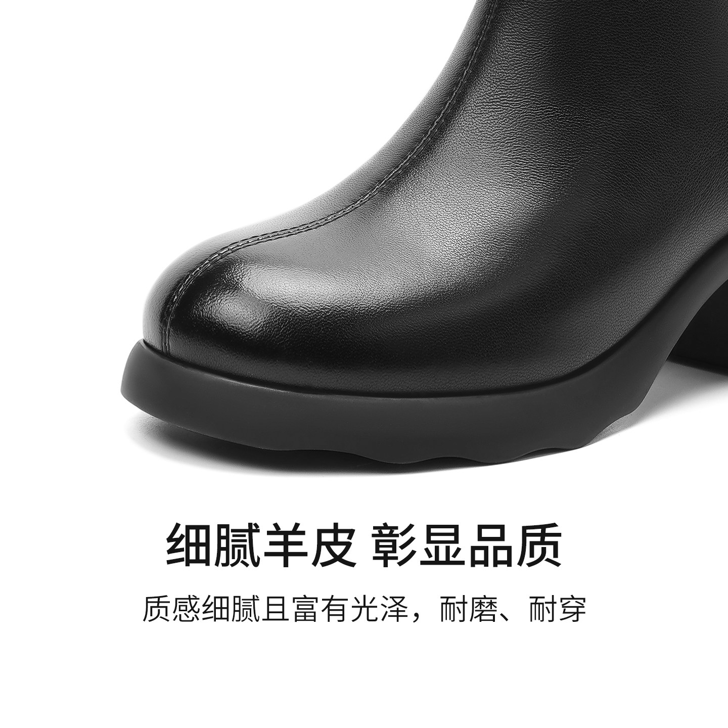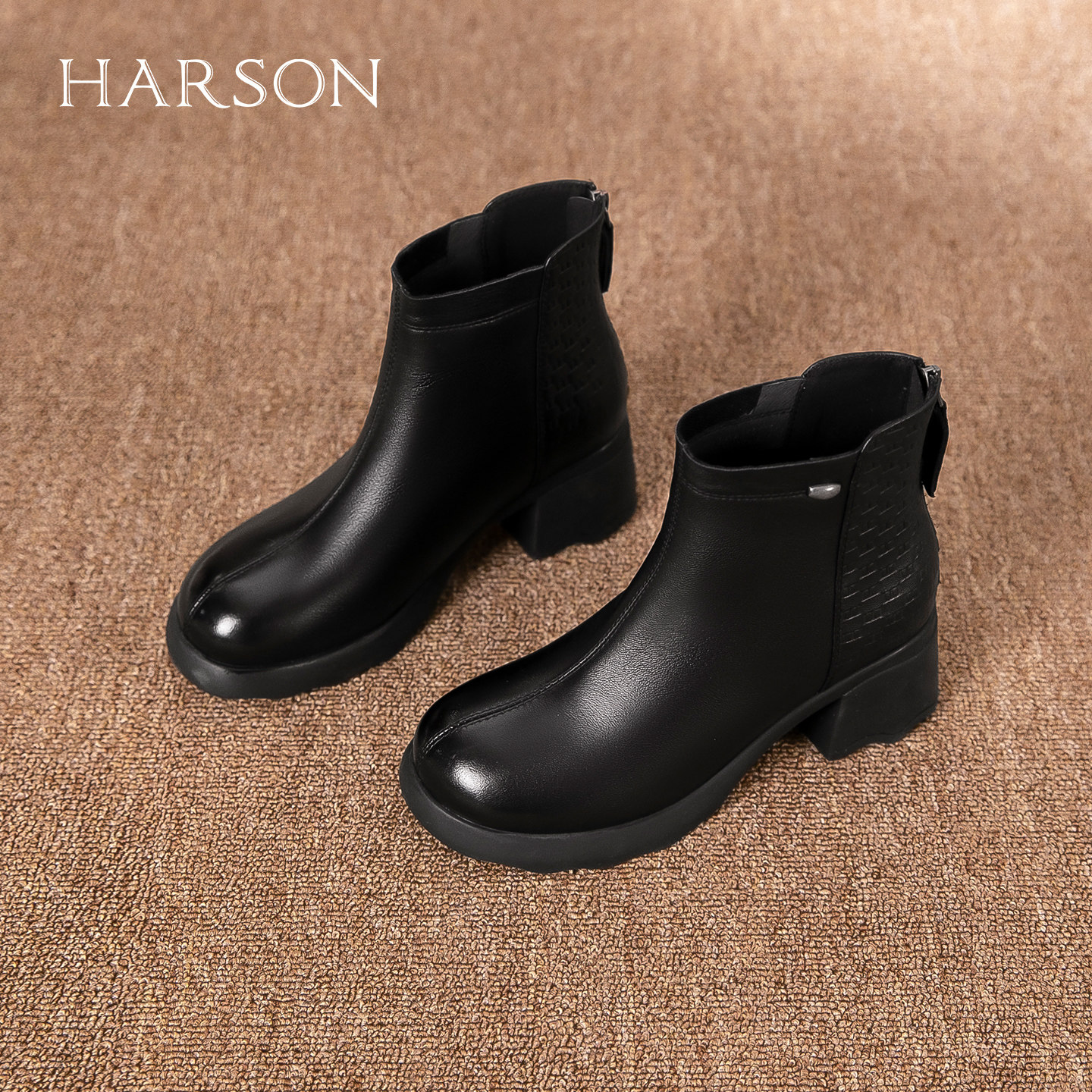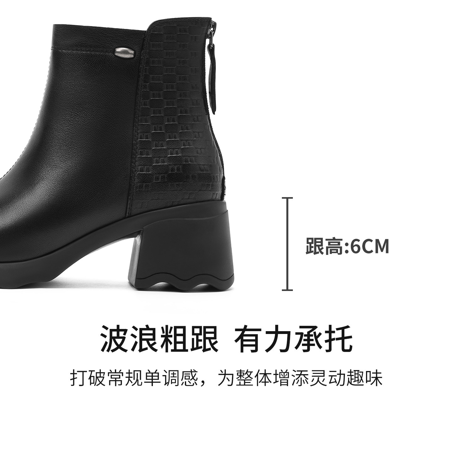 哈森真皮黑色粗高跟时装靴通勤百搭女短靴2025冬新款HWA250122