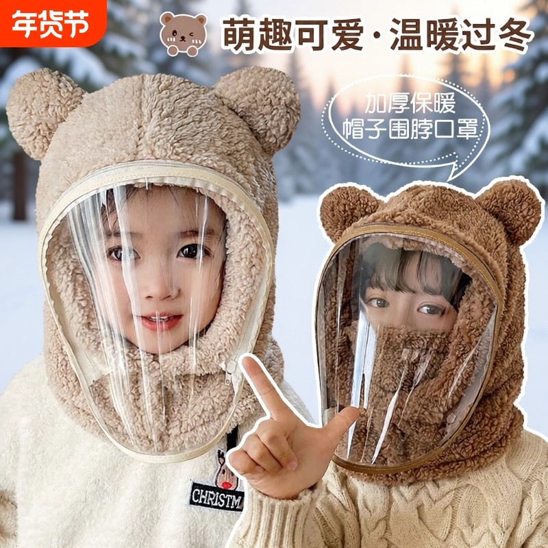 儿童帽子秋冬季男女童户外骑行防风面罩护耳套头帽宝宝围巾一体帽