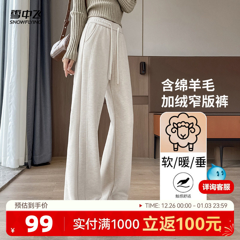 雪中飞2025秋新款女士长加绒阔腿休闲裤显高显瘦舒适保暖米色温柔