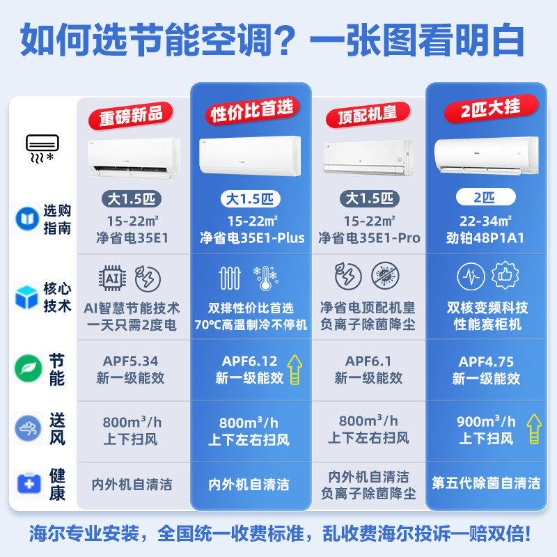 海尔净省电plus1.5匹家用变频空调一级能效节能双排挂机以旧换新