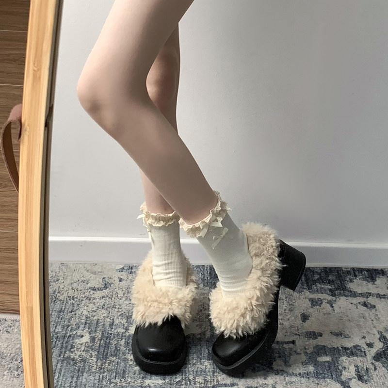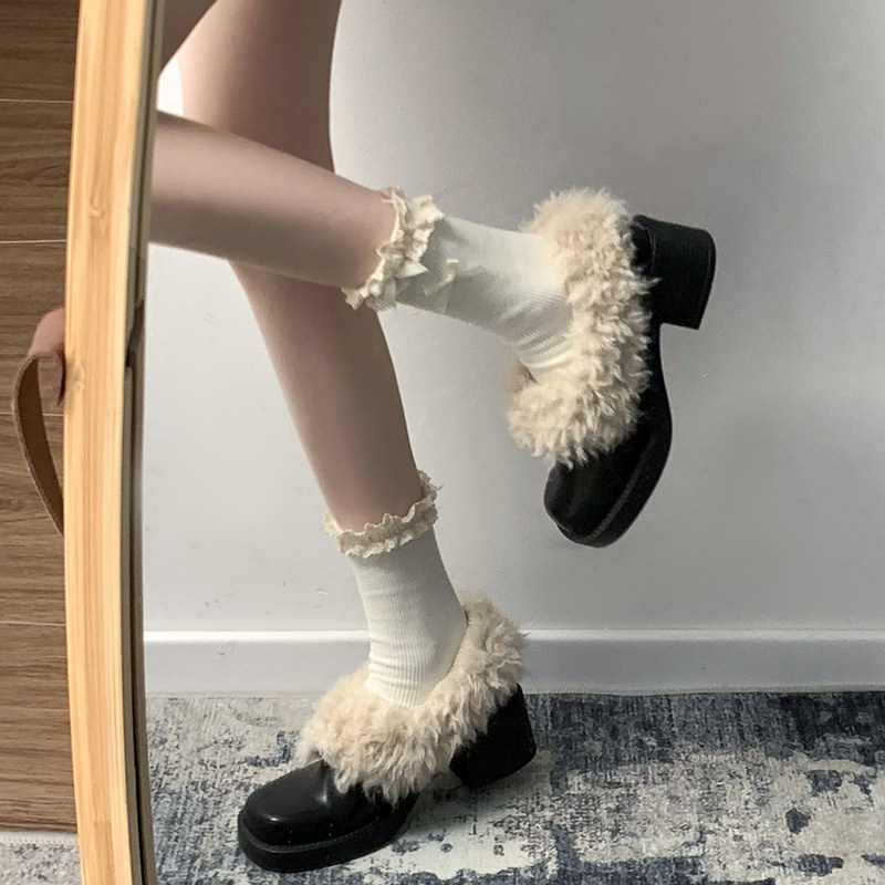 黑色粗跟小皮鞋女2025新款秋冬加绒保暖毛毛鞋玛丽珍一脚蹬高跟鞋