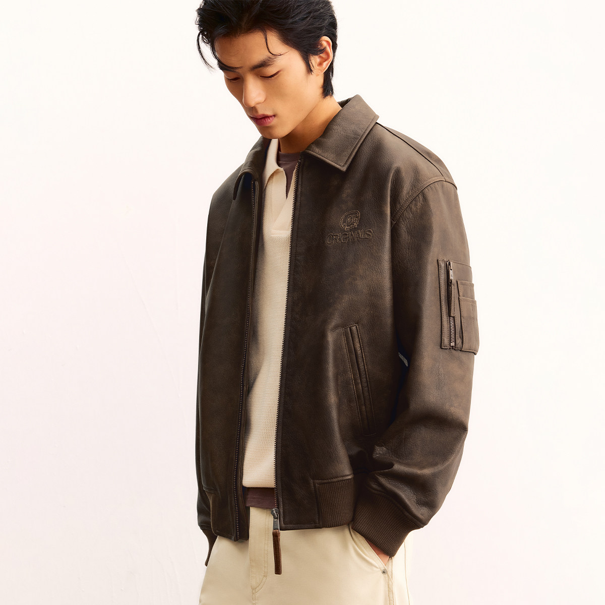 杰克琼斯男装春季新款潮流字母刺绣翻领宽松真皮极简短款夹克外套