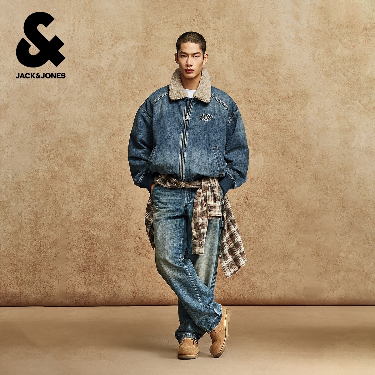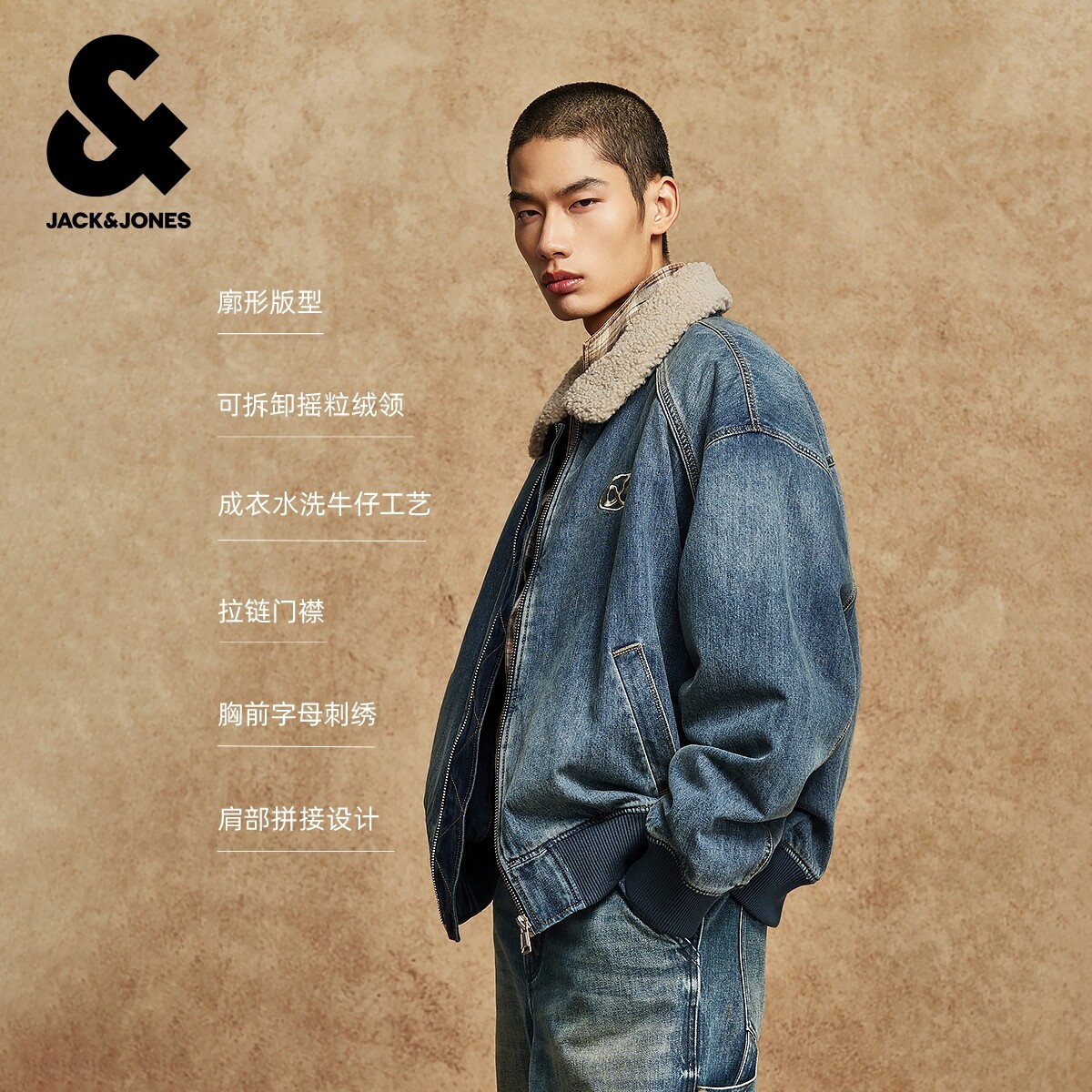 杰克琼斯男装春季夹克2026年潮流廓形夹棉摇粒绒领口深蓝牛仔外套