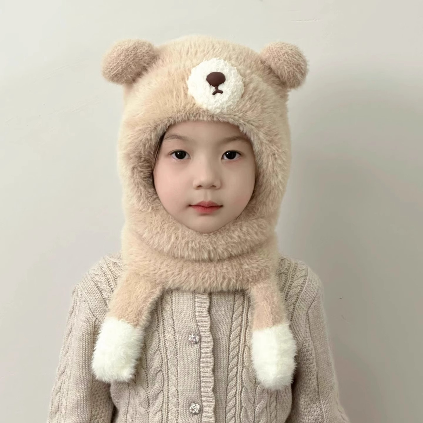 儿童帽子秋冬款可爱小熊男童围脖口罩一体毛绒保暖女宝护耳帽防风
