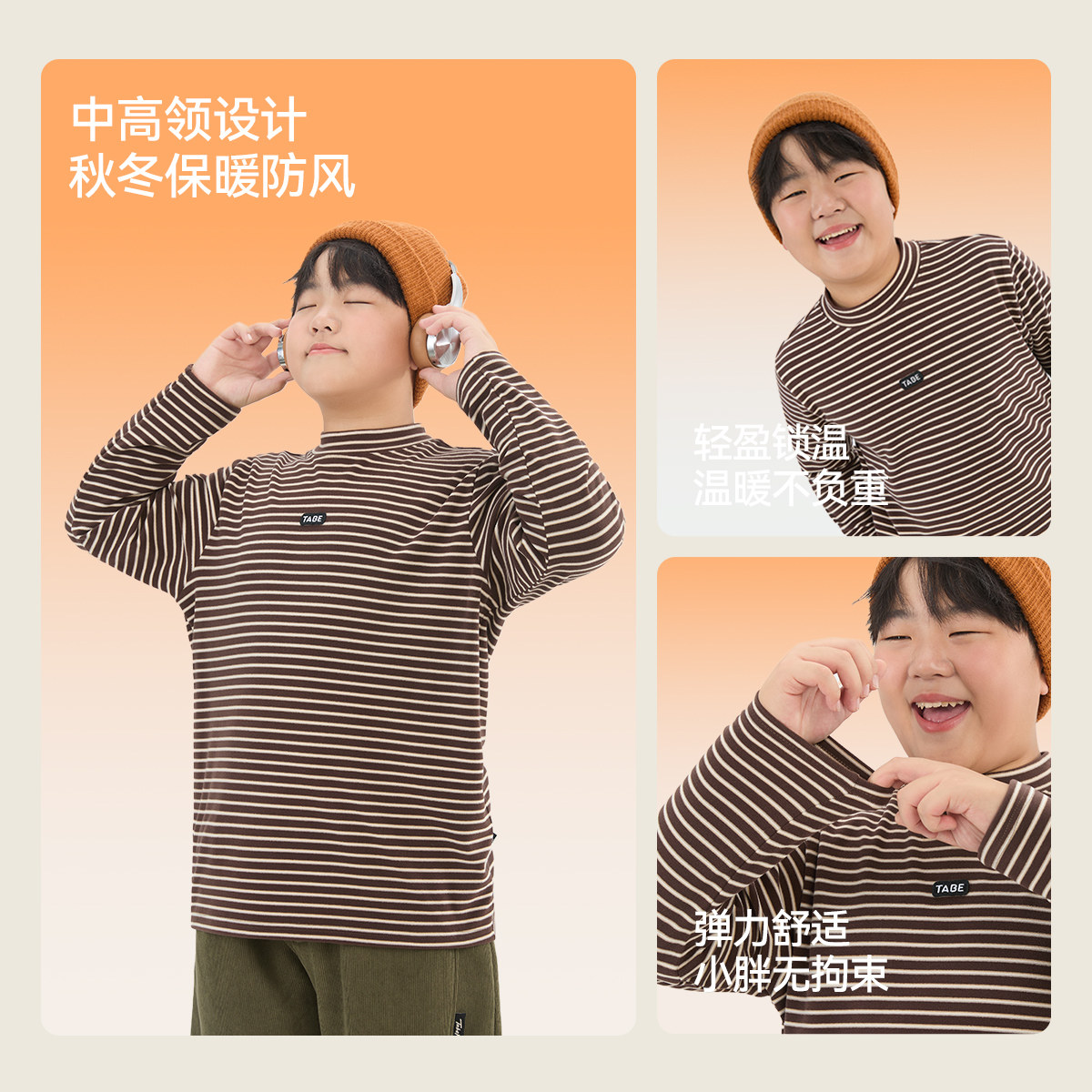 [发热]齐齐熊男童打底衫冬款宝宝条纹儿童半高领T恤童装女童纯色