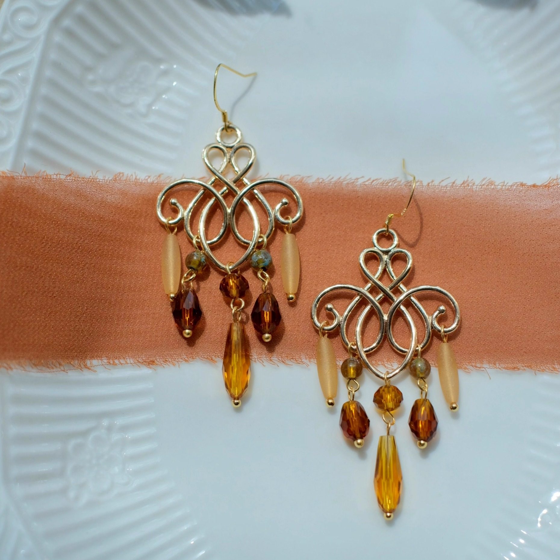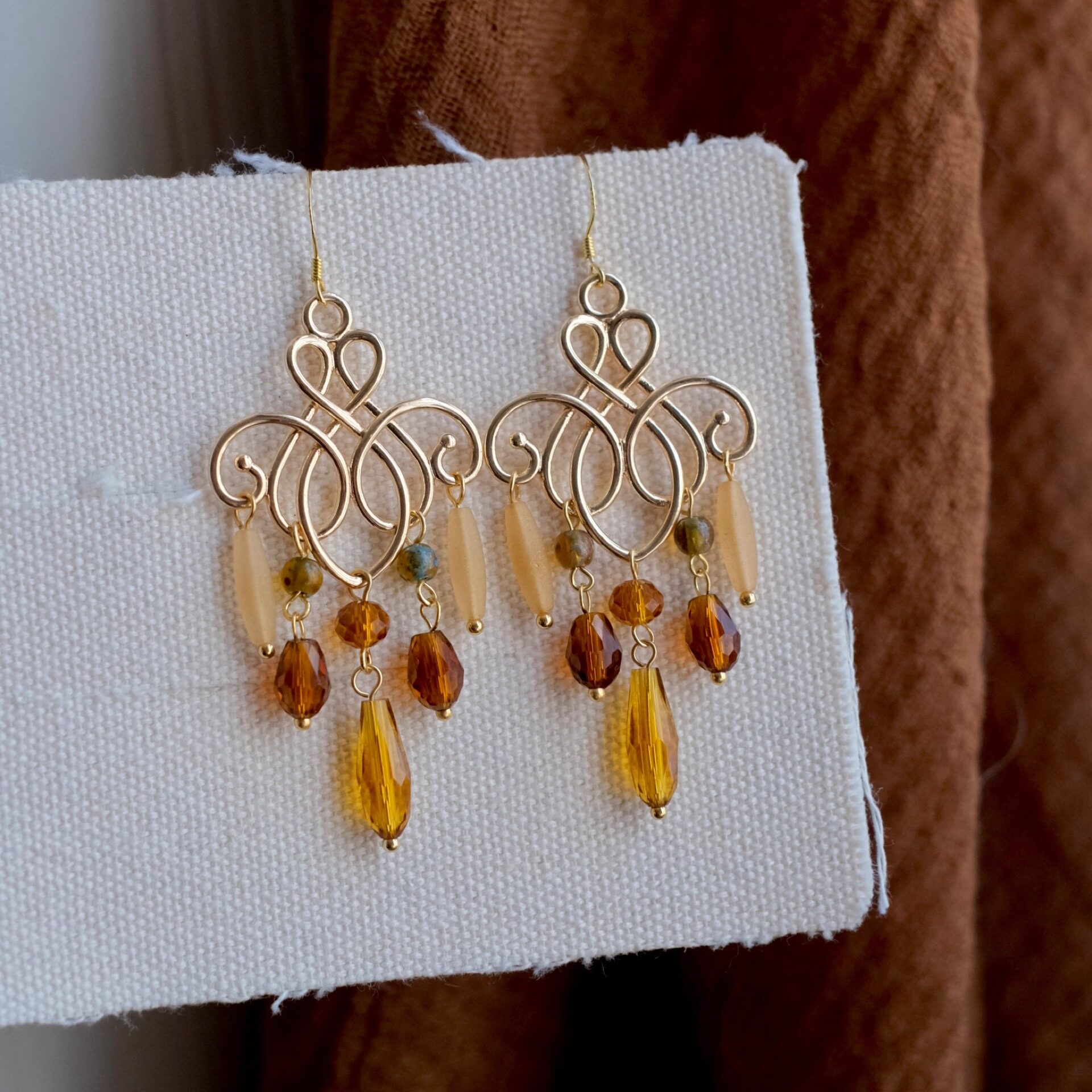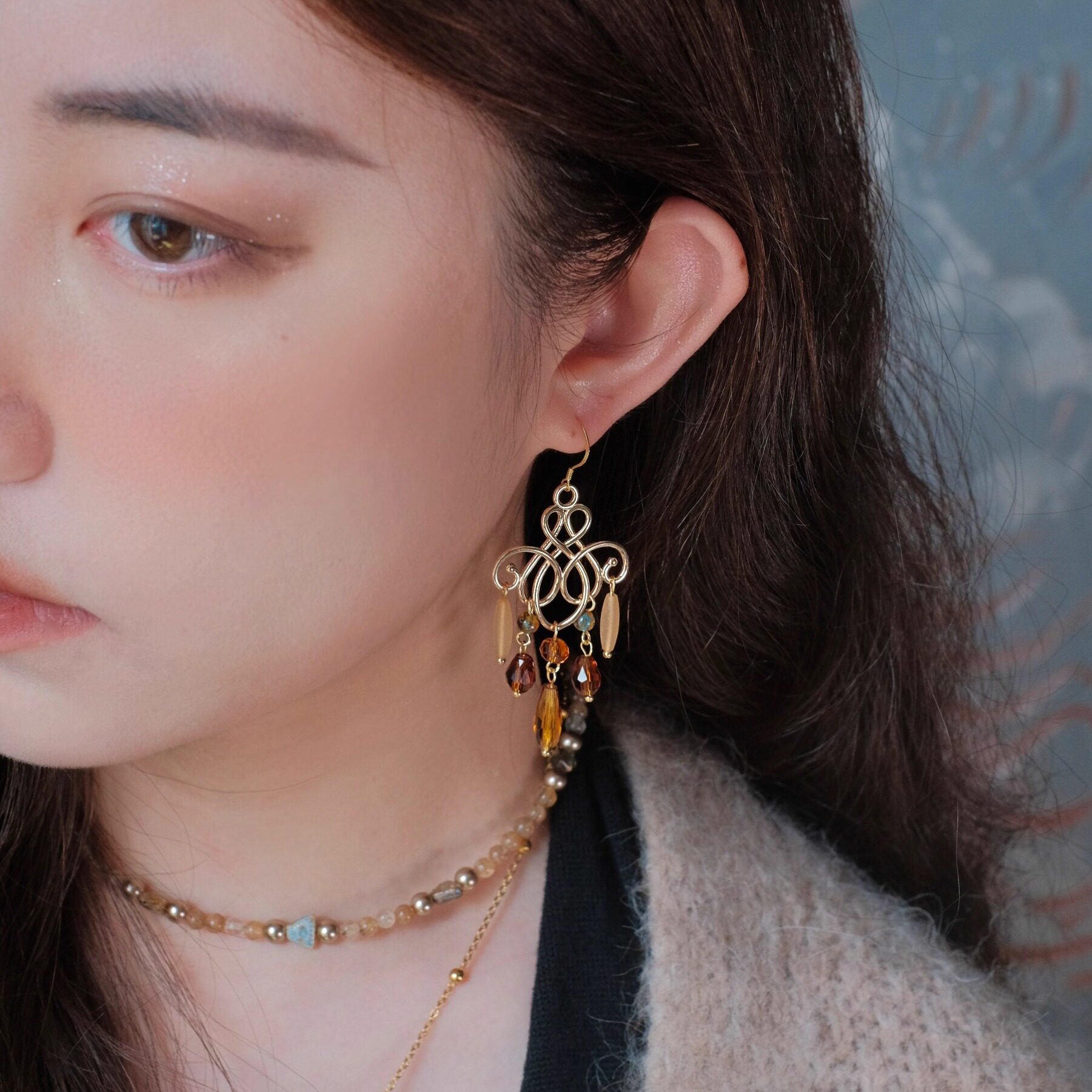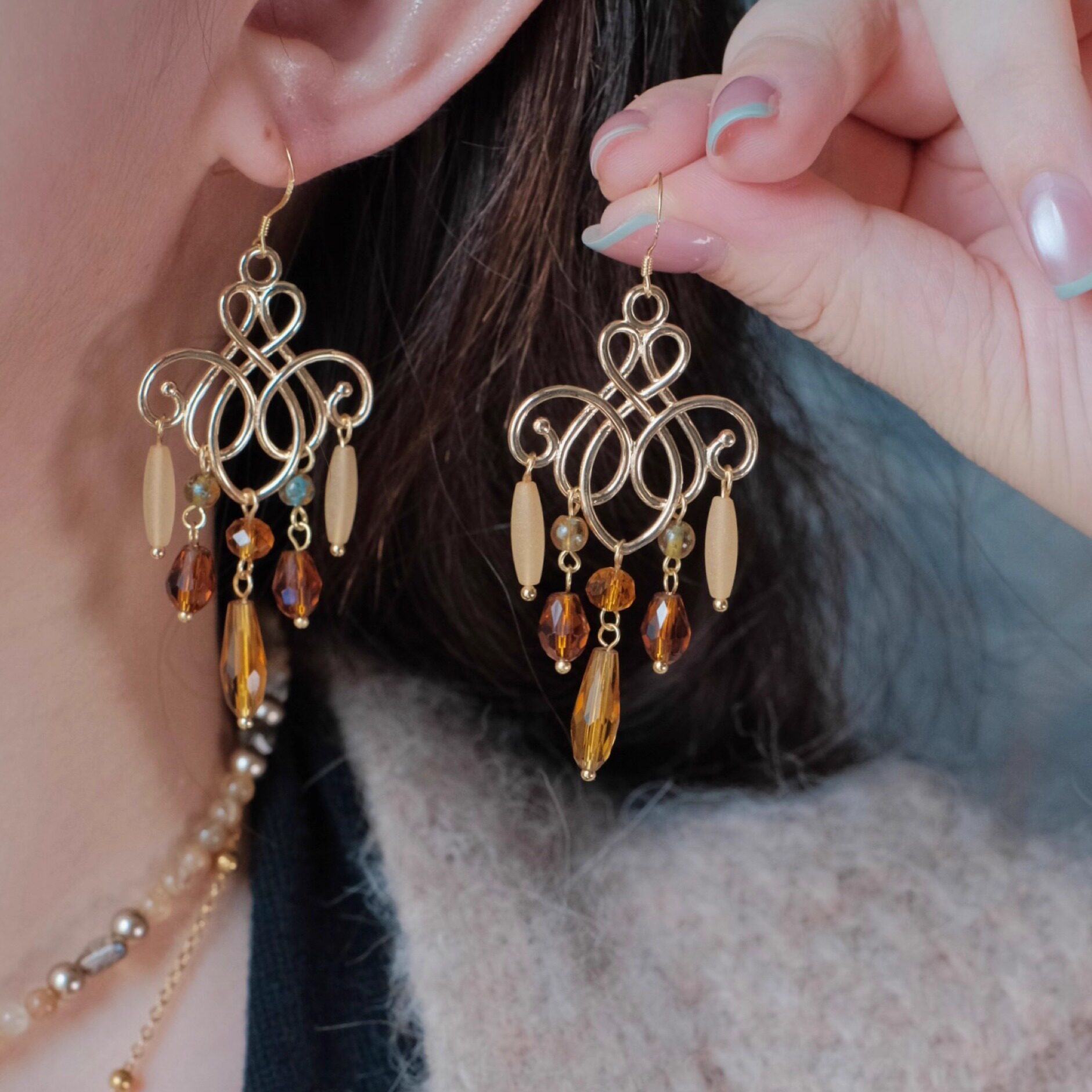 《婆娑》原创秋冬独特琥珀色水晶串珠长款流苏民族风耳环耳夹耳饰