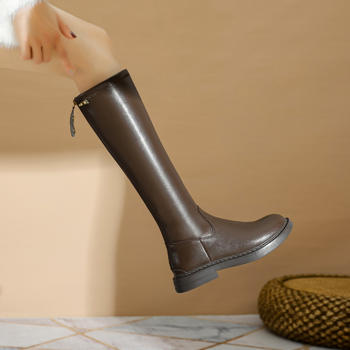 真皮~内增高粗跟骑士靴女秋冬西部靴高筒复古显瘦褶皱堆堆靴长靴