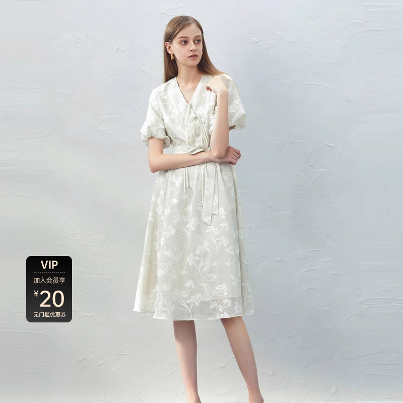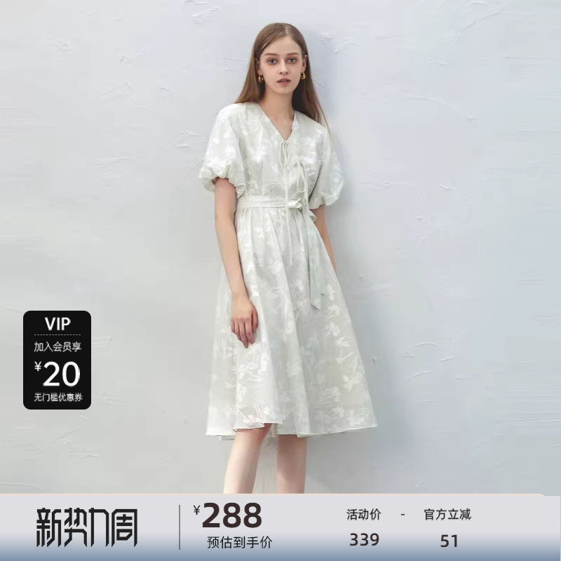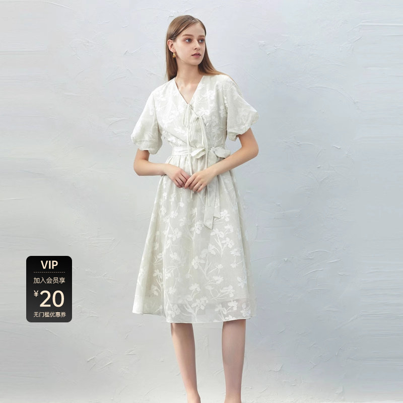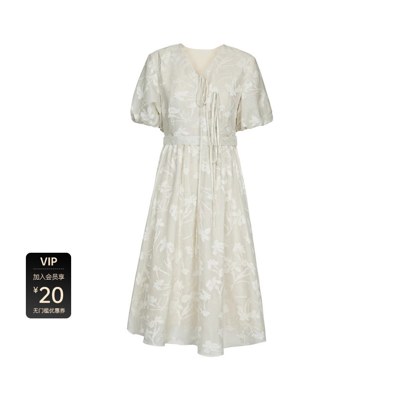 sdeer圣迪奥女装V领系带绣花泡泡袖新中式连衣裙S232Z12QP