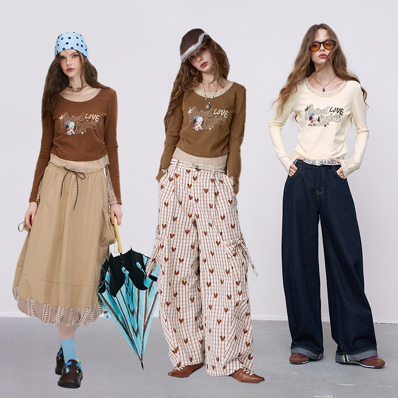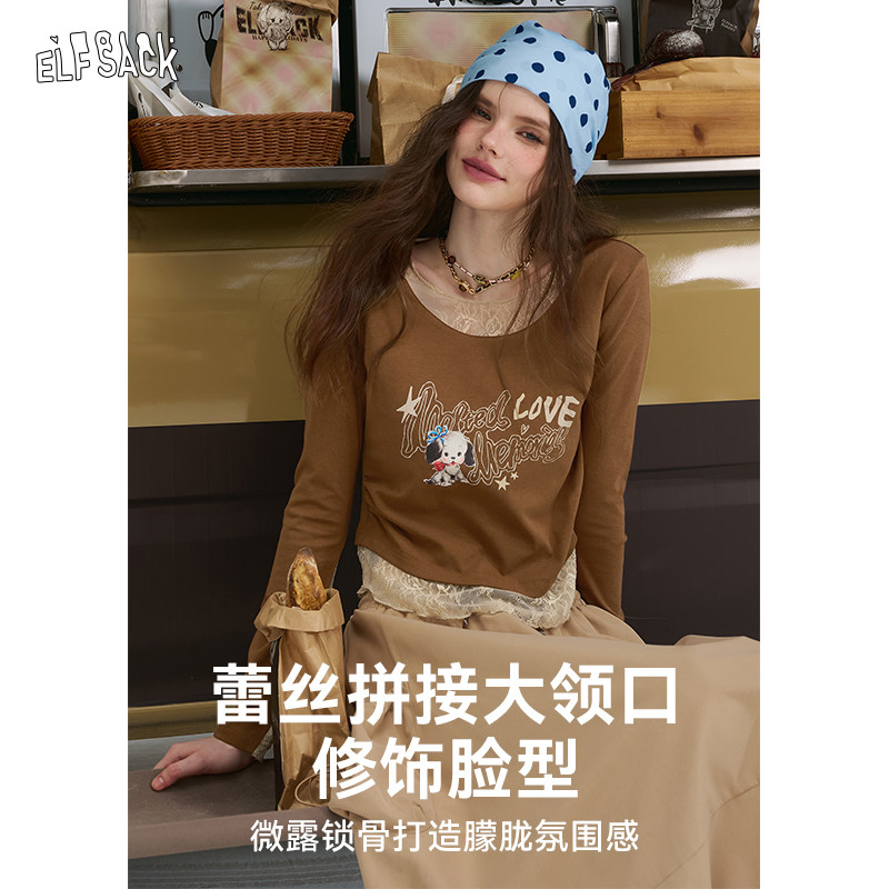 妖精的口袋白色蕾丝拼接印花长袖t恤女2026早春新款修身薄款上衣