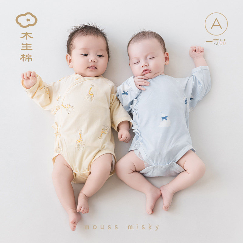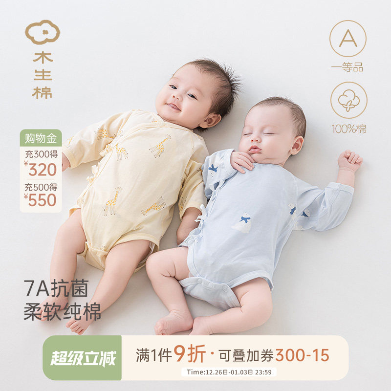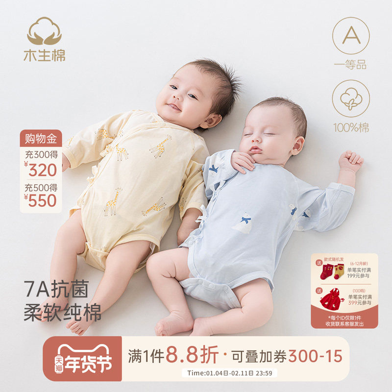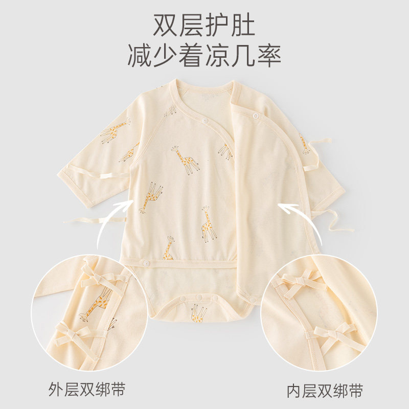 木生棉新生儿长袖连体衣夏季薄款宝宝纯棉婴儿三角哈衣抗菌包屁衣