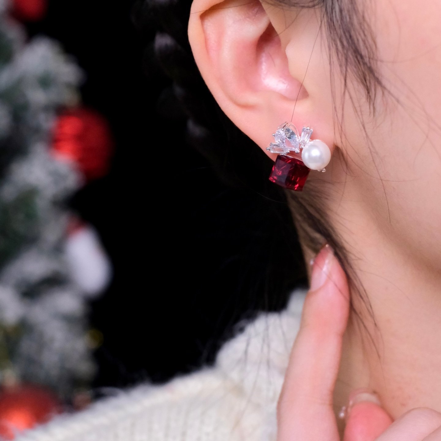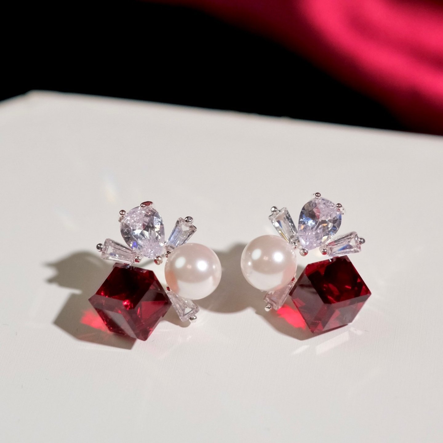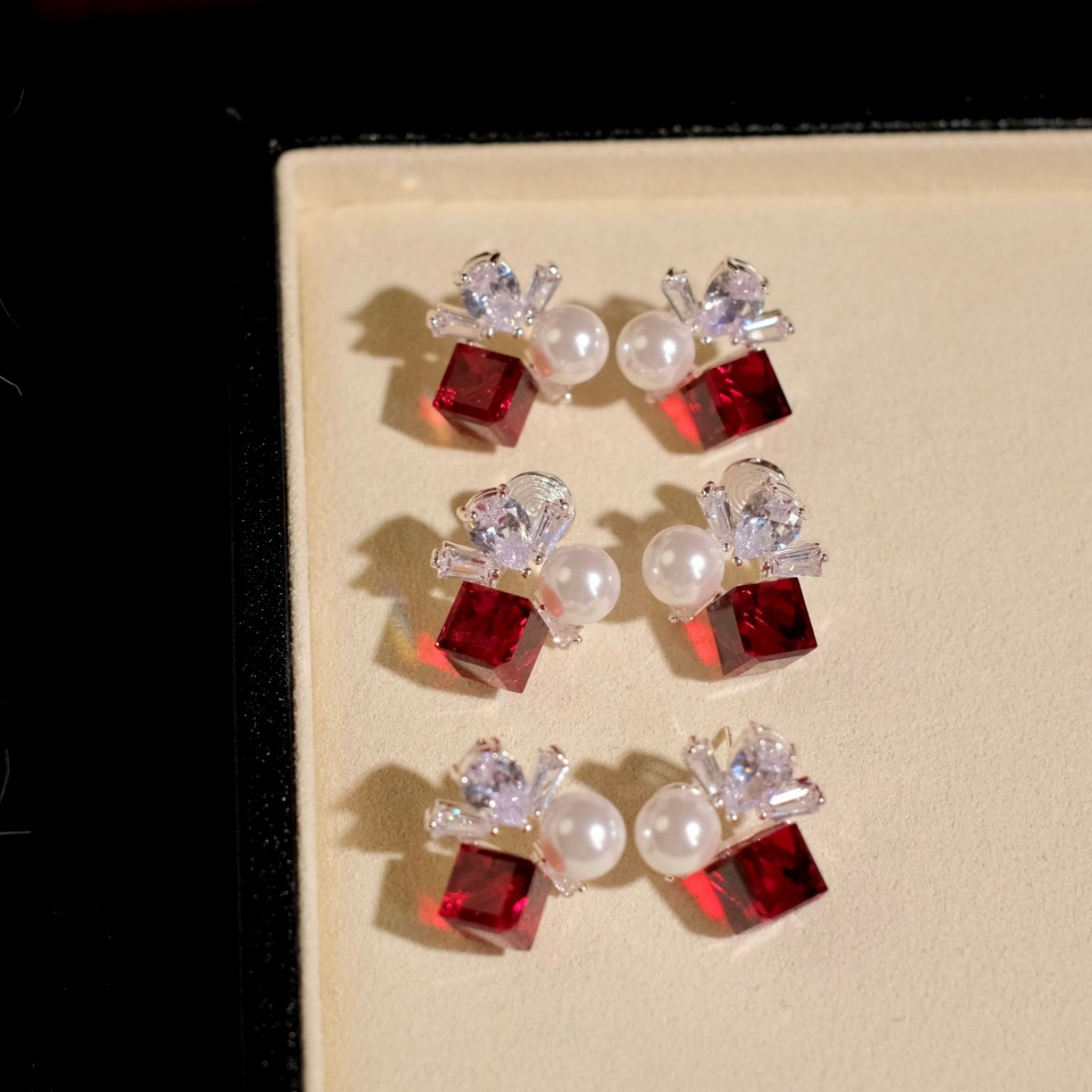 《糖果派对》爆闪精致几何方糖珍珠红色水晶圣诞新年耳钉耳环耳夹